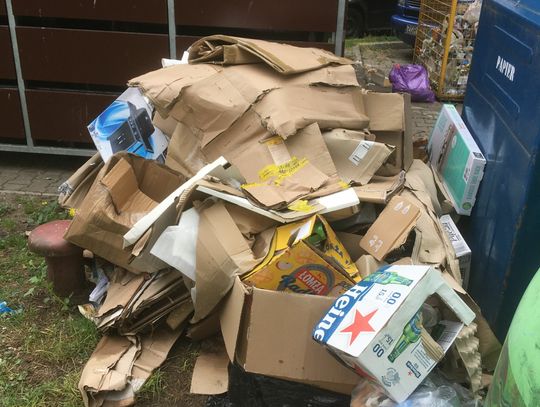 Przyjechał samochód Przedsiębiorstwa Usług Komunalnych i wysypał do środka pseudokontener z zawartością papierów. To nic, że obok leżała jeszcze 2-metrowa pryzma kartonów, które nie weszły do tego pojemnika! Oczywiście pracownik (z uwagi na swoje lenistwo?) nie wrzucił tego do swojego samochodu, bo po co? Niech sobie karton zalega!