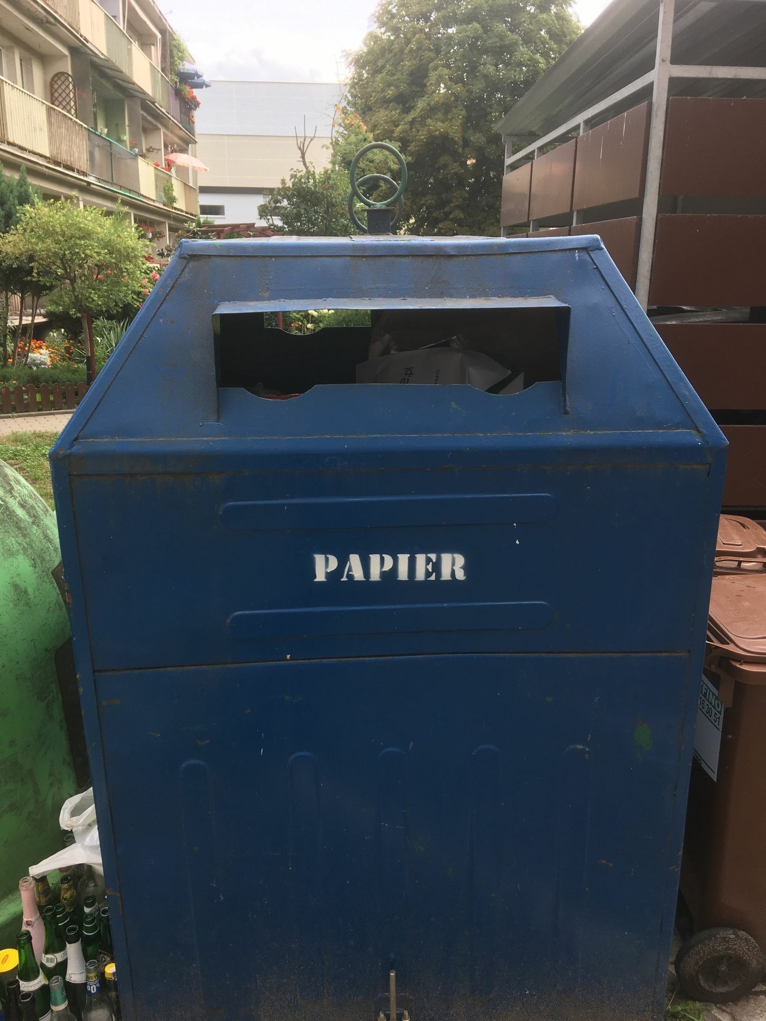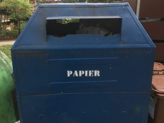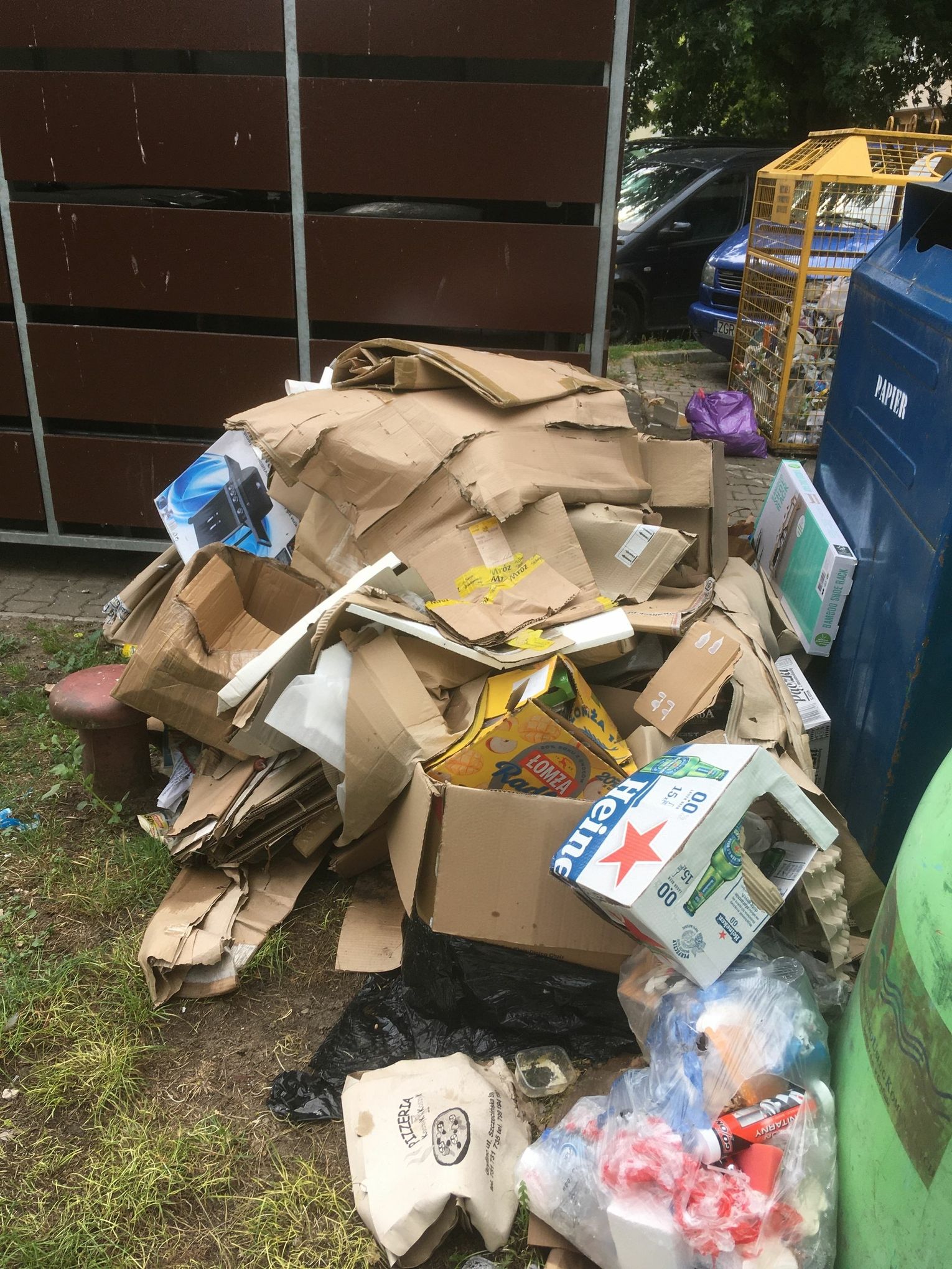 Nawiasem mówiąc te pojemniki postawiono chyba tylko po to, aby łatwo było je podpinać do hdsa, bo kompletnie konstrukcyjnie nie nadają się do wrzucania tam kartonów i papieru. Każdy karton czy większą papierową rzecz trzeba rwać na kawałki, a jeśli się tego nie zrobi, to wystarczy, że ktoś wrzuci 2 większe kartony i pojemnik pełny. Dzieje się tak dlatego, bo w środku jest stalowa rura, która blokuje wrzucanie większych gabarytów. I tak sobie teraz ten stosik leży, troszkę mniejszy, bo popadał deszcz. Jest jednak nadzieja, że urośnie, bo znów pojemnik prawie pełny.
