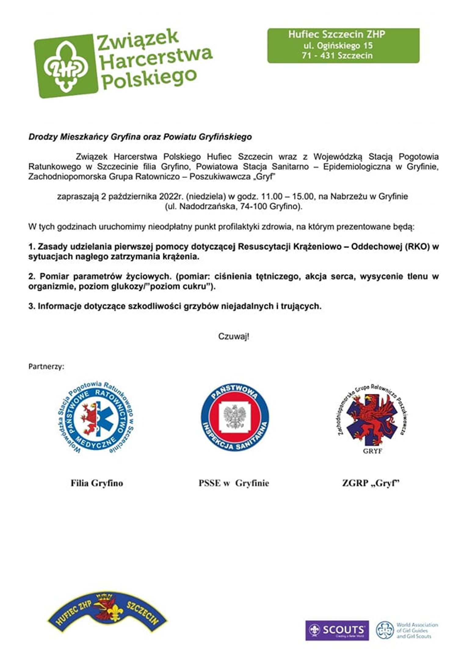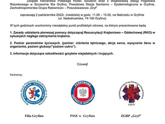 Wojewódzka Stacja Pogotowia Ratunkowego Filia Gryfino – Chojna, Powiatowa Stacja Sanitarno-Epidemiologiczna w Gryfinie, Hufiec ZHP Szczecin, Zachodniopomorska Grupa Ratowniczo-Poszukiwawcza GRYF zapraszają dzisiaj 2 października 2022r. (niedziela) na gryfińskie nabrzeże. Jest tam uruchomiony nieodpłatny punkt profilaktyki zdrowia.
