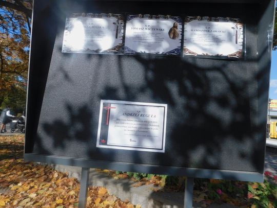 Na tablicach informacyjnych zamieszczono klepsydry z następującymi nazwiskami: