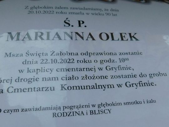 Msza św. żałobna odprawiona zostanie 22 października 2022 r. o godz. 10.00 w kaplicy cmentarnej w Gryfinie.
