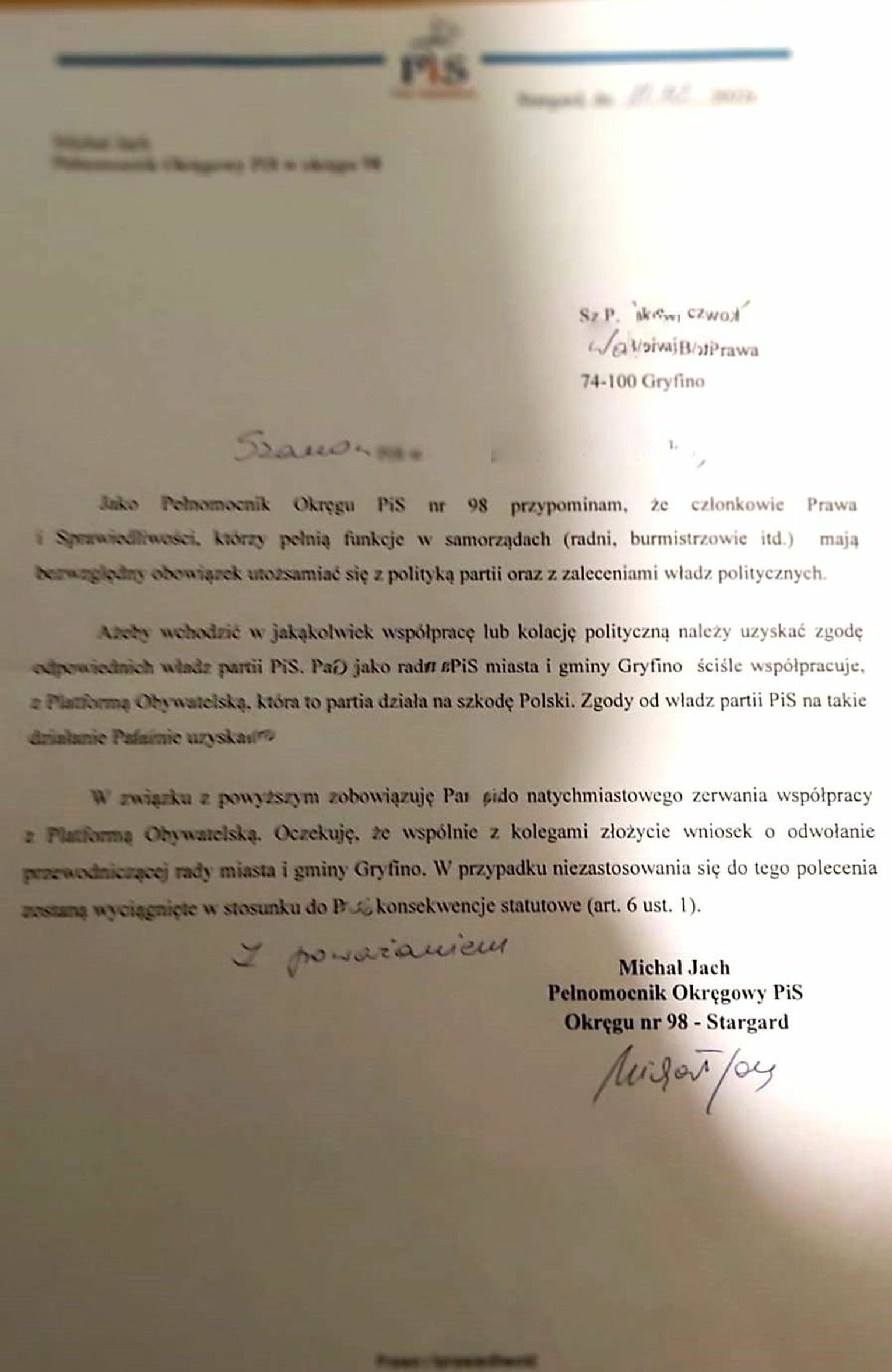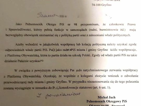 Publikowane pismo posła Jacha do radnych PiS to dowód na to, jak poseł chce sobie podporządkować gryfińską radę. To pismo ma pomóc jego koledze Mieczysławowi Sawarynowi zdobyć większość w Radzie Miejskiej. Wtedy nie musiałby przedstawiać programu oszczędnościowego, a mógłby po prostu podnieść podatki.