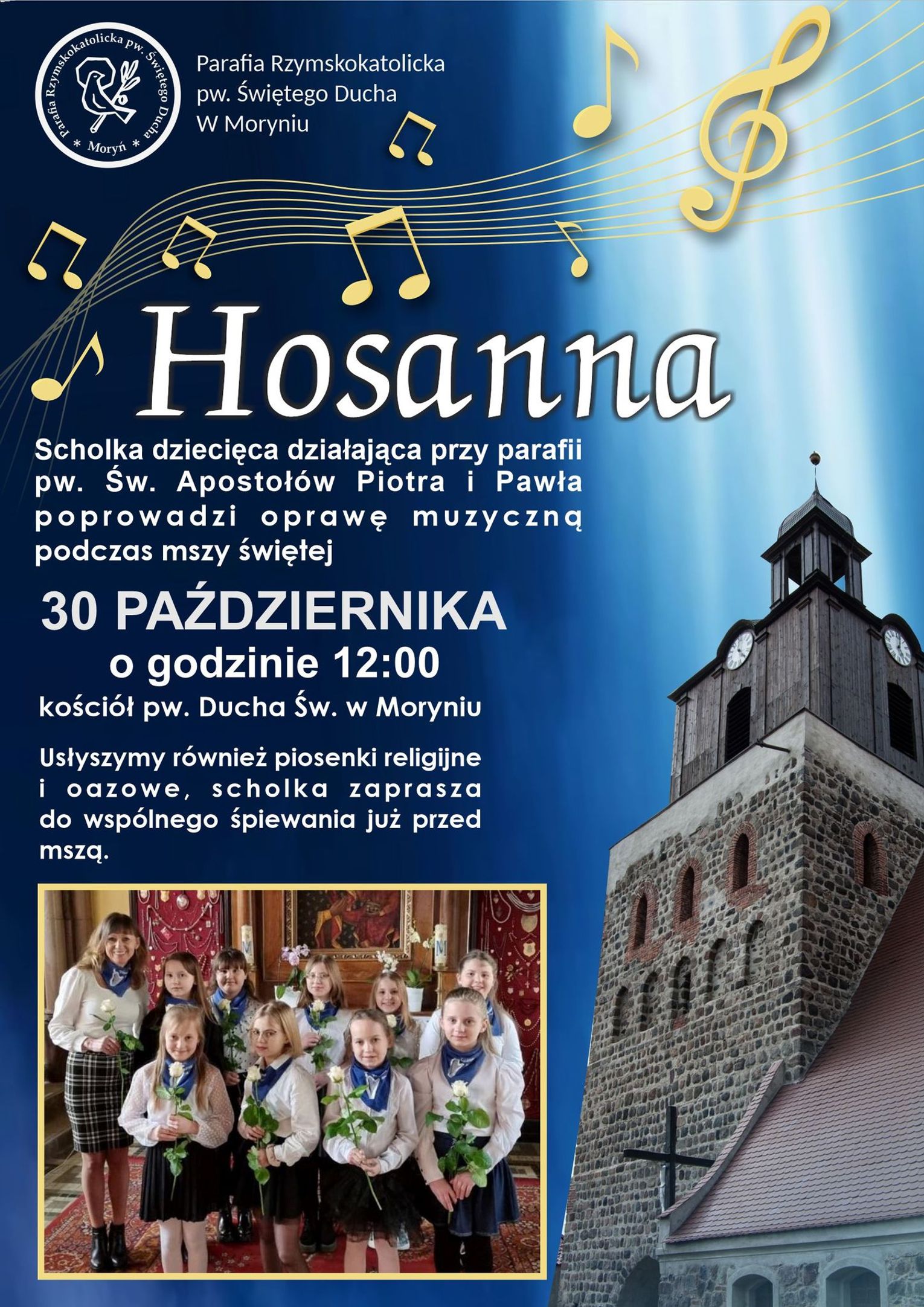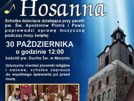 Hosanna to nazwa dziecięcej scholki w Dębnie. Zespół wykona w jednym z kościołów powiatu gryfińskiego oprawę muzyczną liturgii mszy świętej. Będzie można też posłuchać koncertu piosenek religijnych i oazowych.