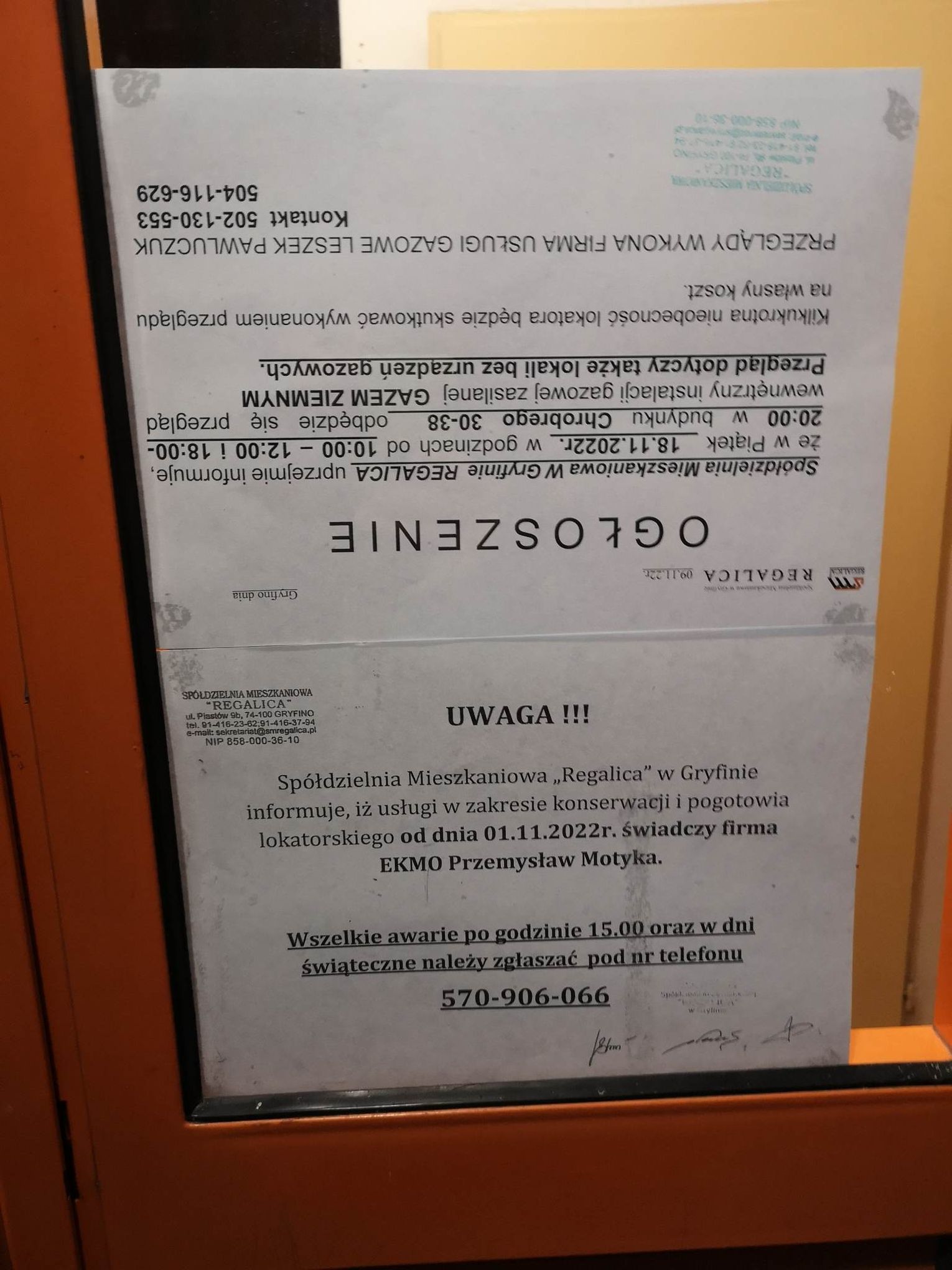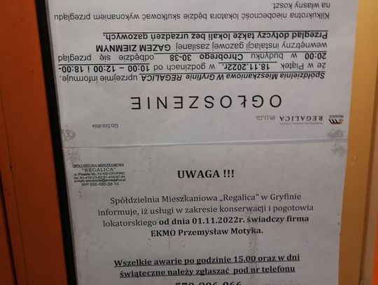 Spółdzielnia Mieszkaniowa "Regalica" w Gryfinie umieściła na drzwiach wejściowych bloków dwa ogłoszenia.