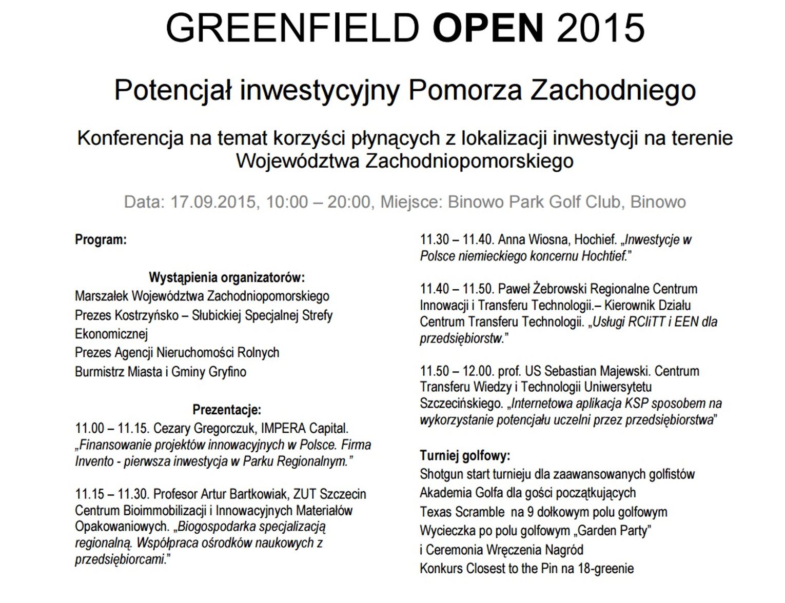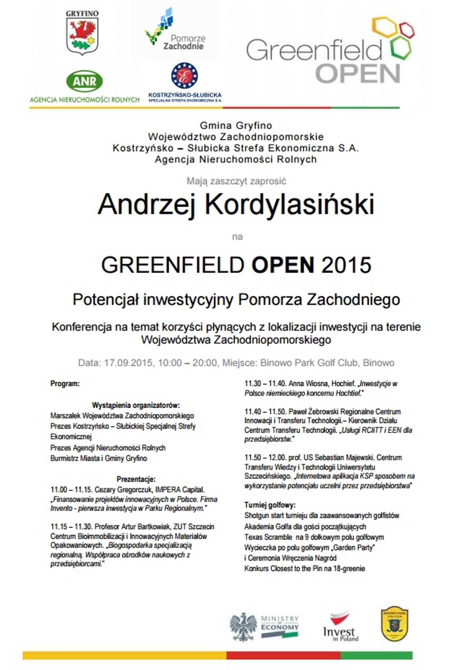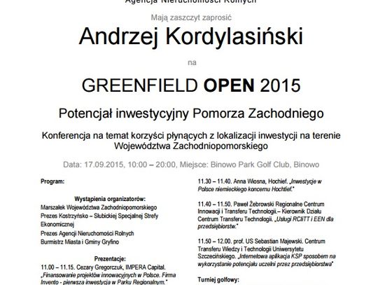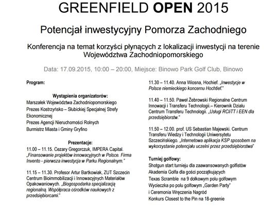 Gmina Gryfino organizuje Greenfield Open 2015 – jak informuje na zaproszeniu - przy współpracy z Województwem Zachodniopomorskim, Kostrzyńsko-Słubicką Strefą Ekonomiczną S.A. oraz Agencją Nieruchomości Rolnych.