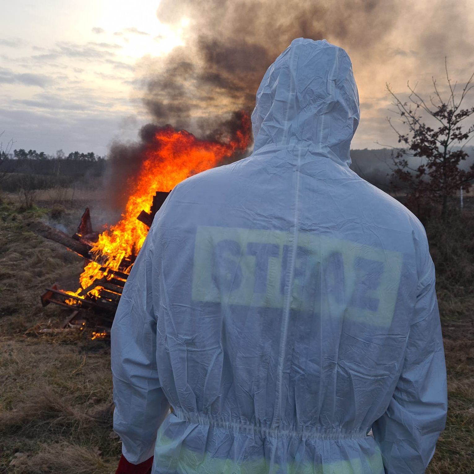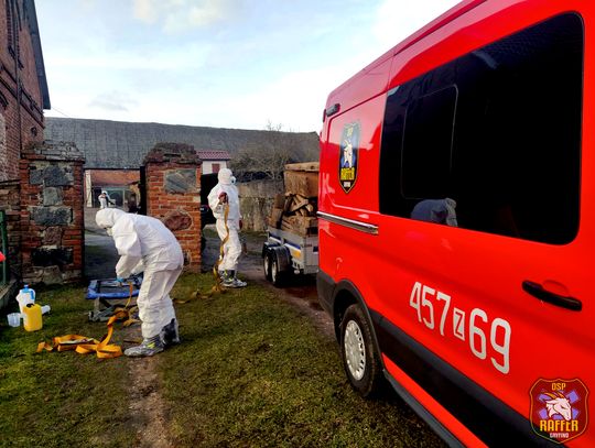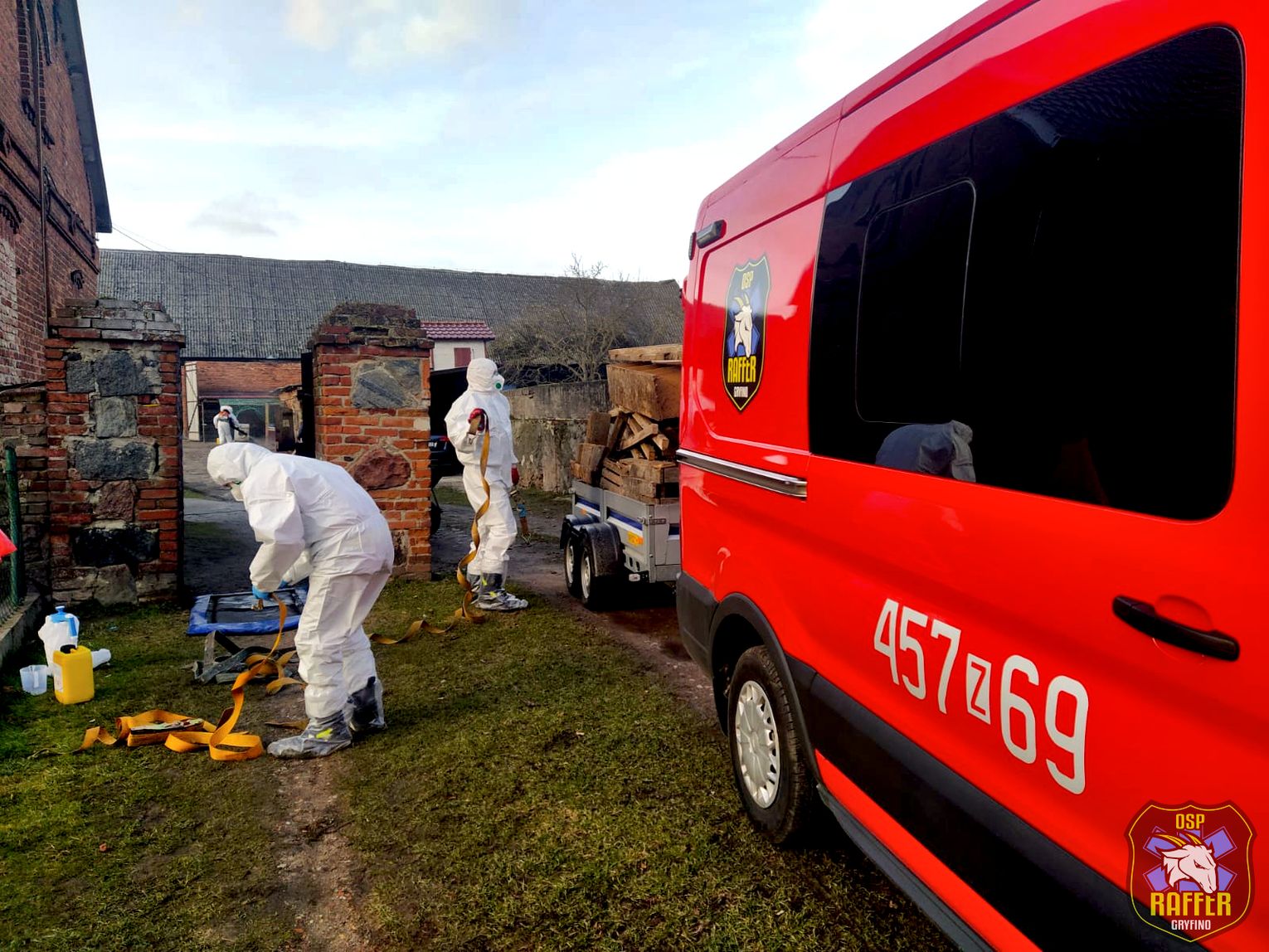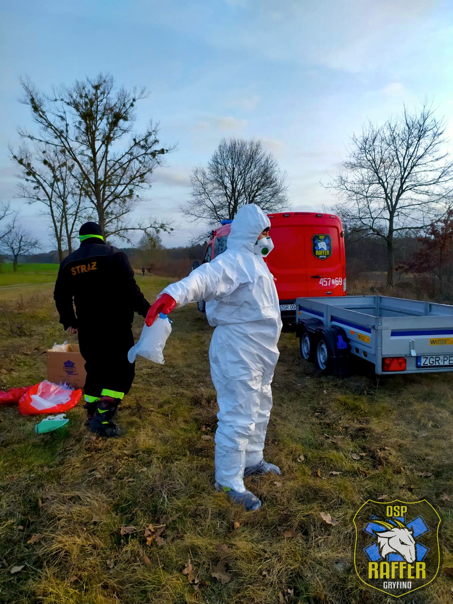 Strażacy z jednostek OSP Wełtyń, OSP Sobieradz, OSP Radziszewo, OSP Raffer Gryfino i Powiatowy Inspektorat Weterynarii w Gryfinie prowadzili dziś kolejne działania związane z likwidacją ogniska choroby zakaźnej – wysoce zjadliwej grypy ptaków (HPAI) na terenie gminy Gryfino.