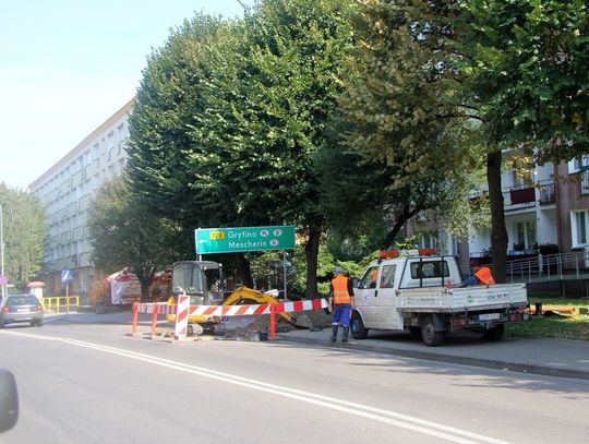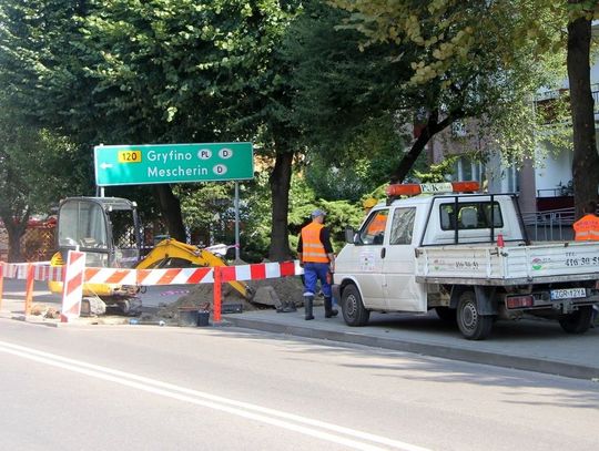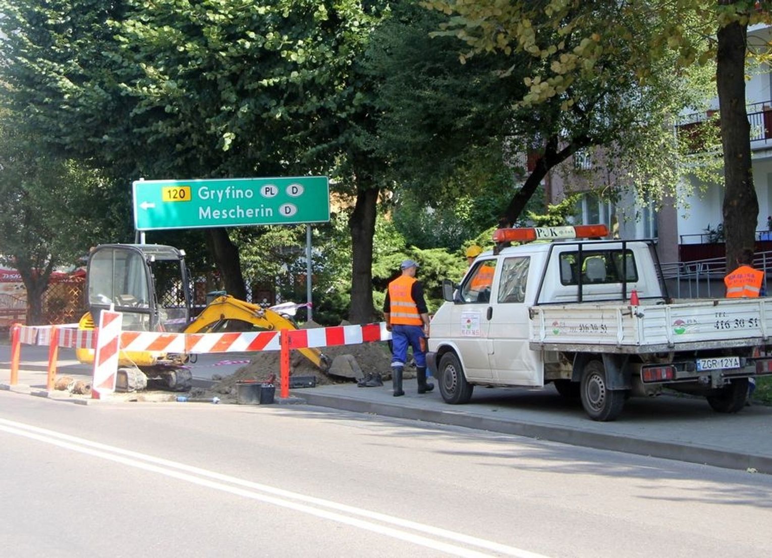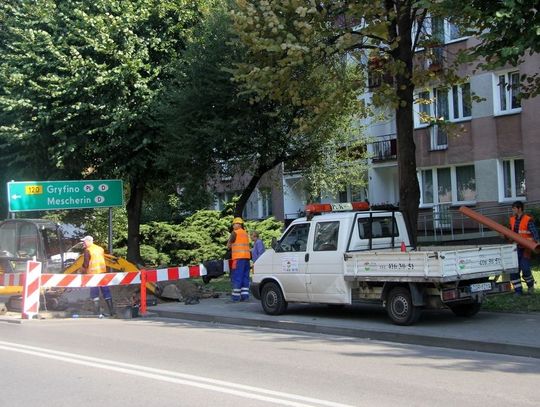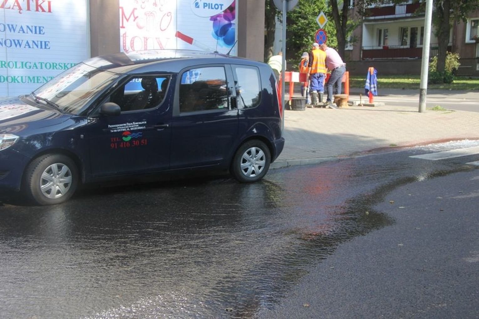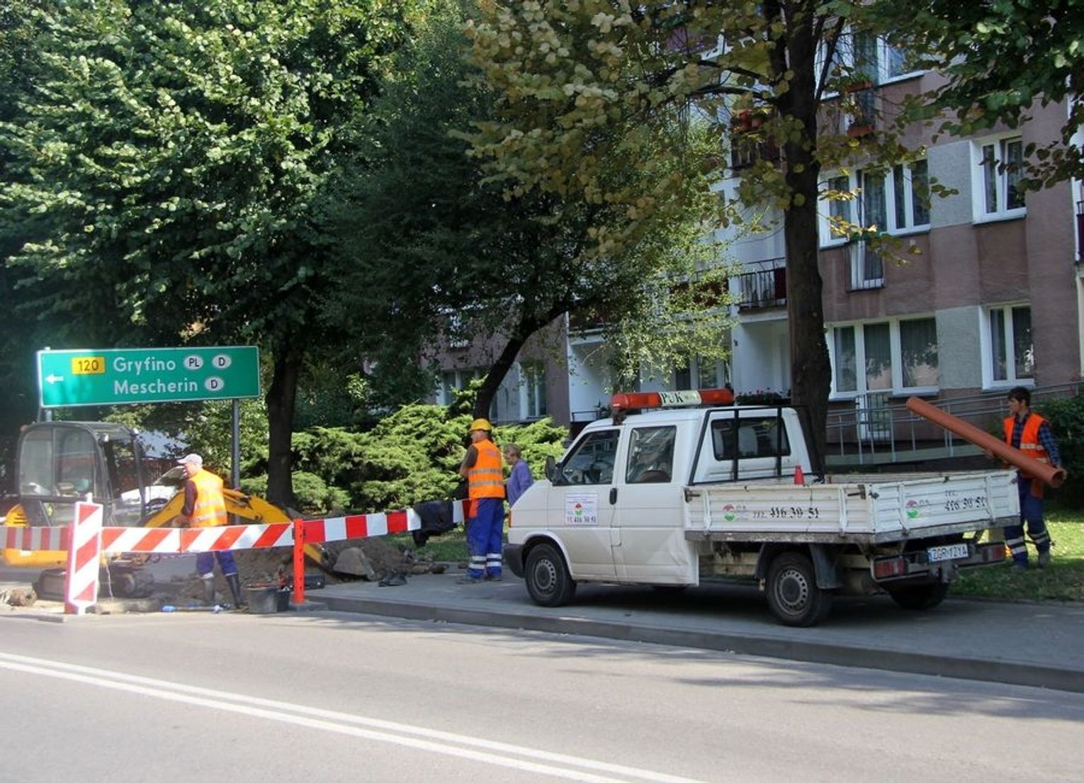 Wszystko tak wyglądało, że to jakaś awaria. Z głównej ulicy w Gryfinie w stronę Kościelnej leje się woda. Część pasa jezdni ulicy Chrobrego zajęta jest przez pracowników Przedsiębiorstwa Usług Komunalnych w Gryfinie. Większa część chodnika blokowana przez pracownków PUK. Staraliśmy się dowiedzieć co się dzieje?