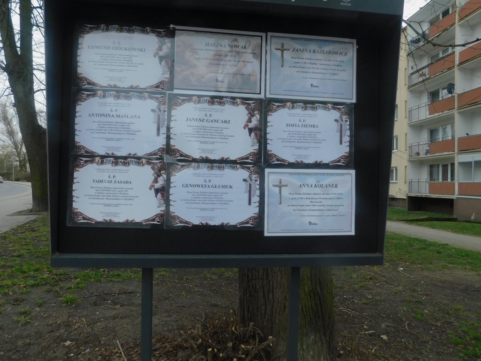 Na tablicach informacyjnych zamieszczono klepsydry z następującymi nazwiskami: