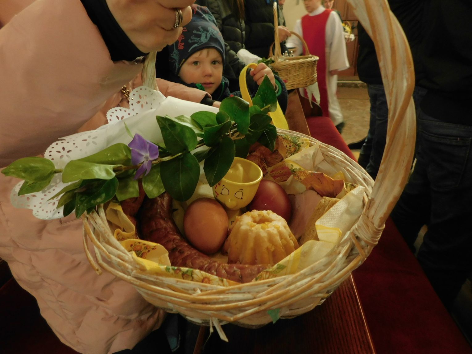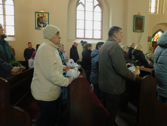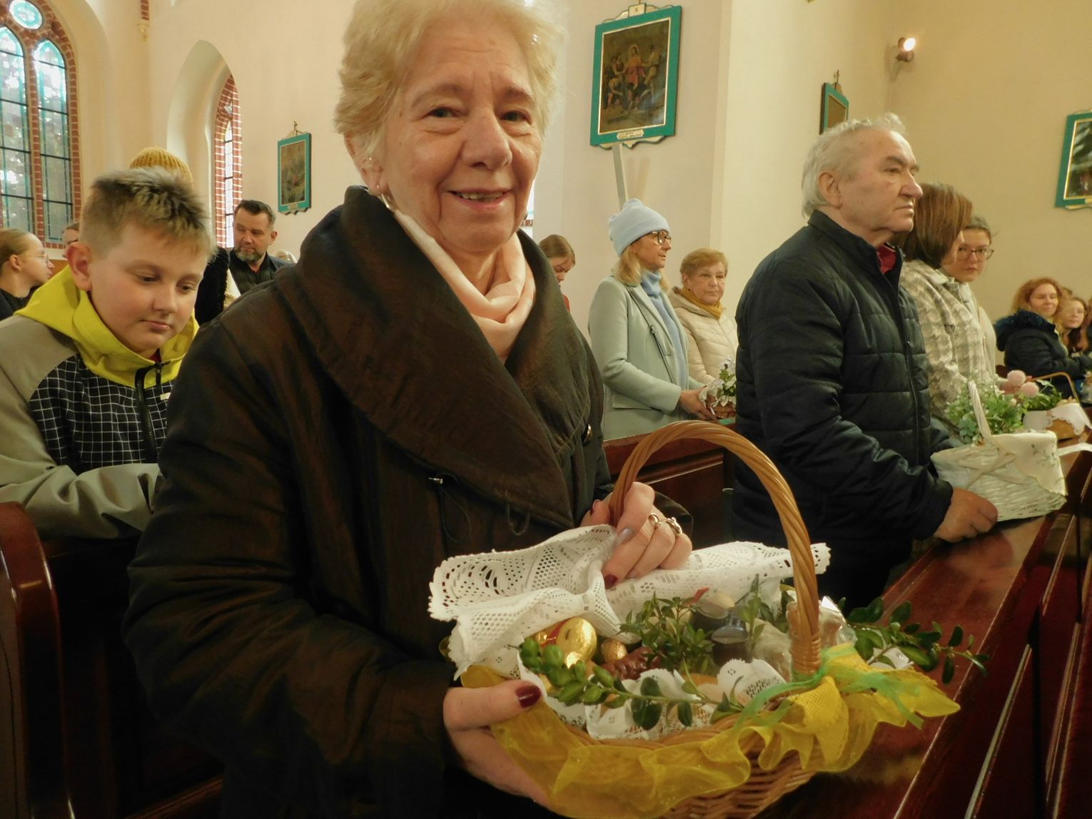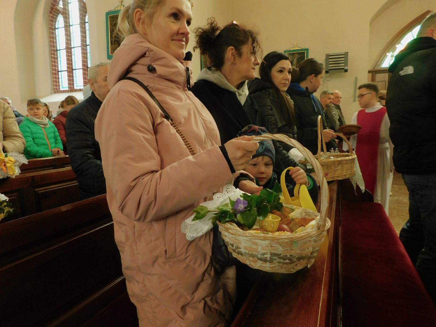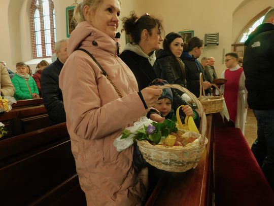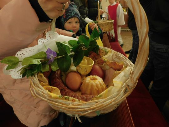 Koszyczki przyniesione do gryfińskiego kościoła są pięknie udekorowane. A w koszyczkach co dusza zapragnie! Kurczak, bardzo ważny, bez niego przecież jajka by nie było, kromka chleba, chrzan i sól, pachnąca kiełbasa, kawałek ciasta, cukrowy baranek.
