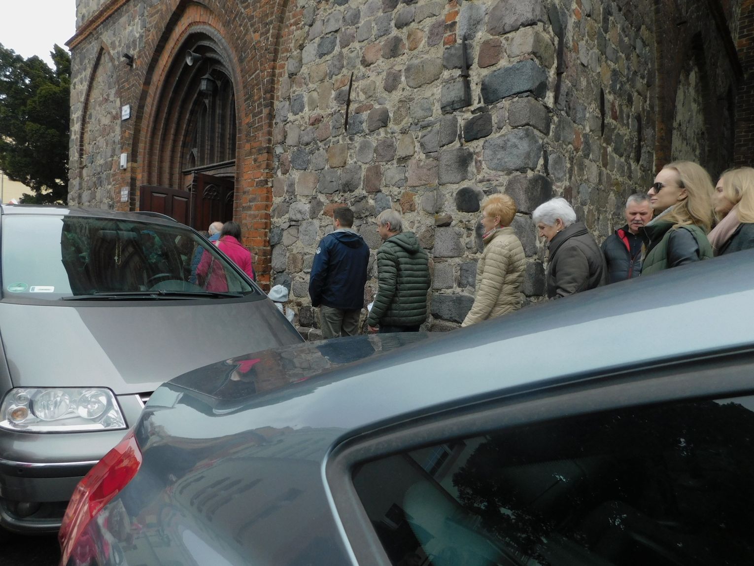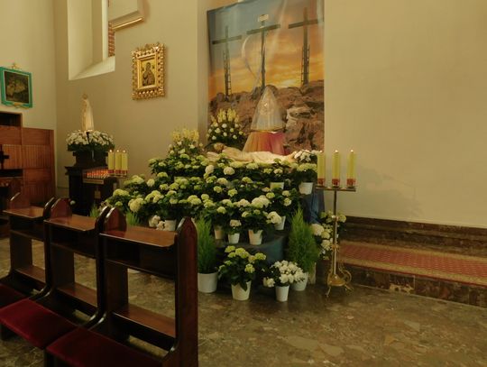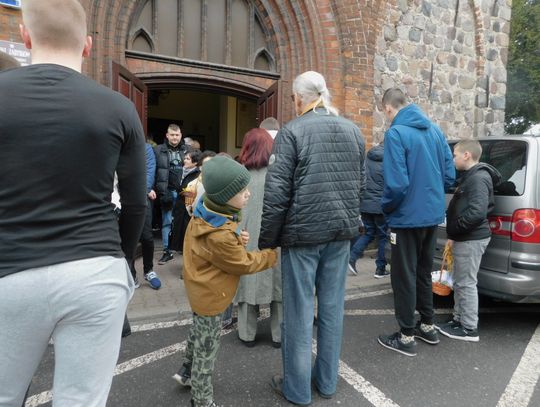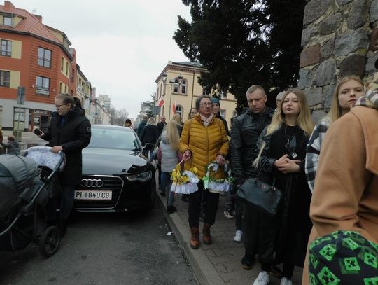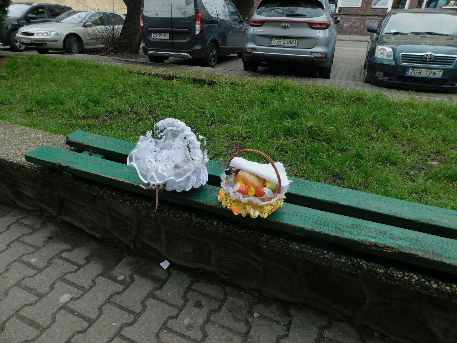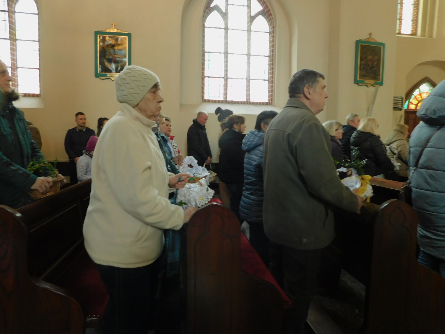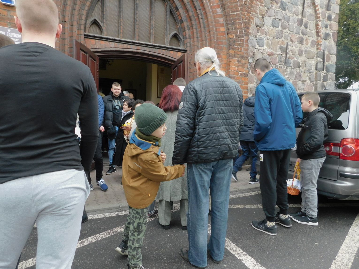 Koszyczki przyniesione do gryfińskiego kościoła są pięknie udekorowane. A w koszyczkach co dusza zapragnie! Kurczak, bardzo ważny, bez niego przecież jajka by nie było, kromka chleba, chrzan i sól, pachnąca kiełbasa, kawałek ciasta, cukrowy baranek.