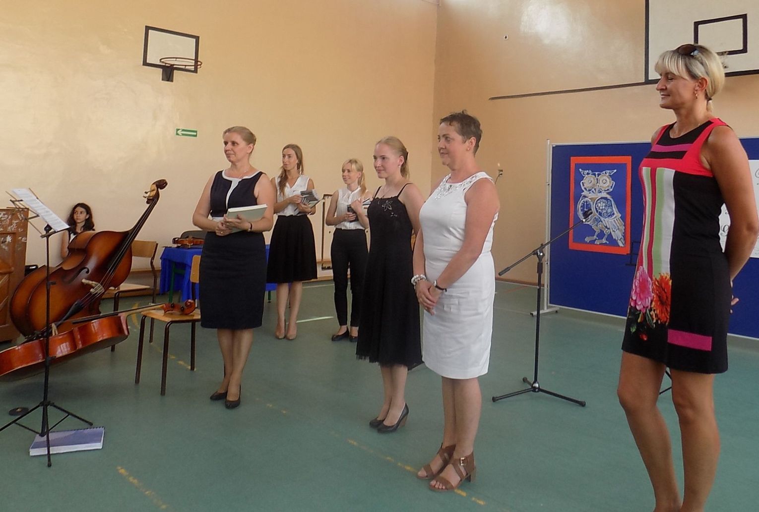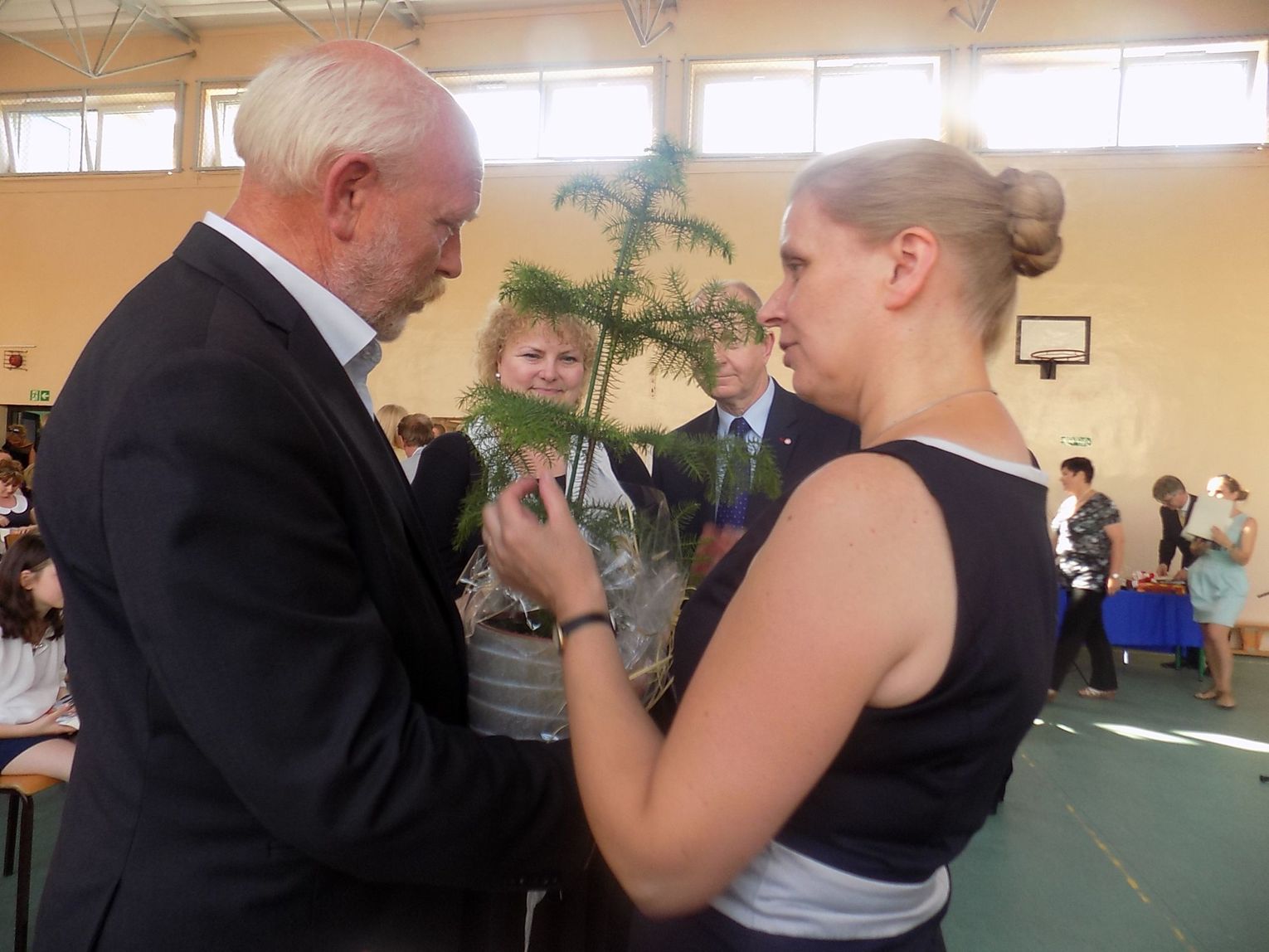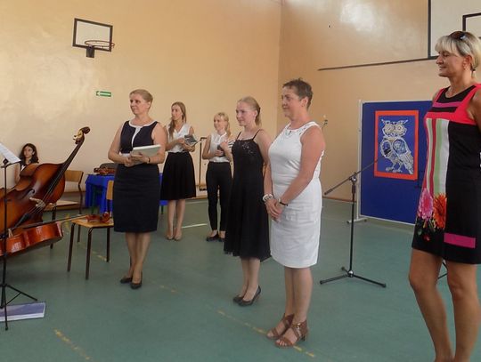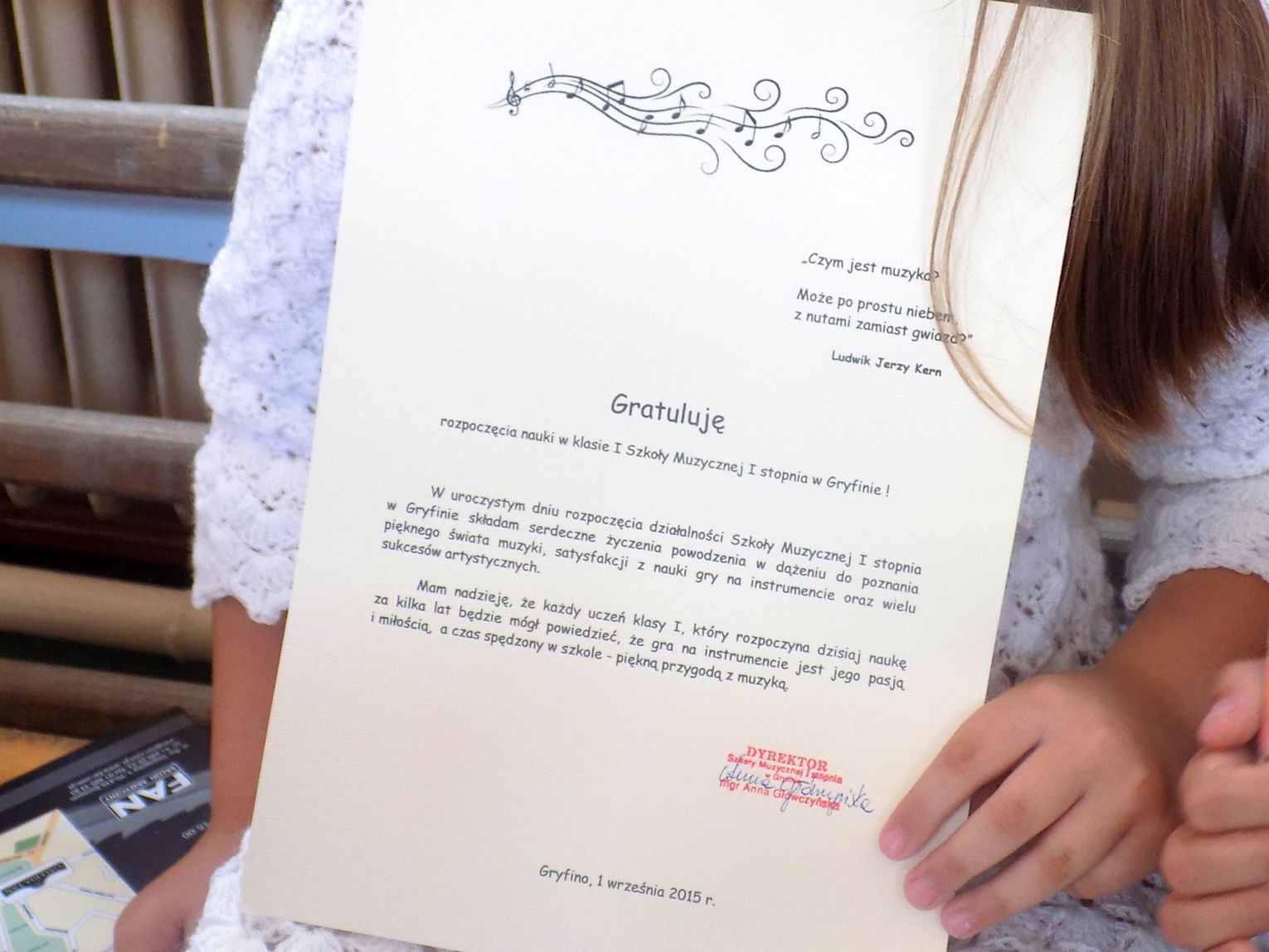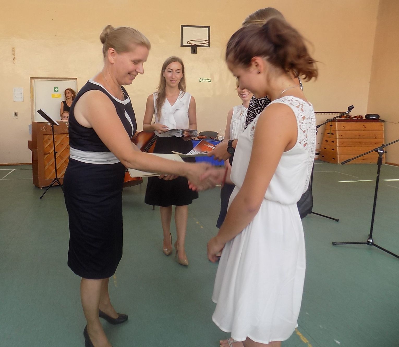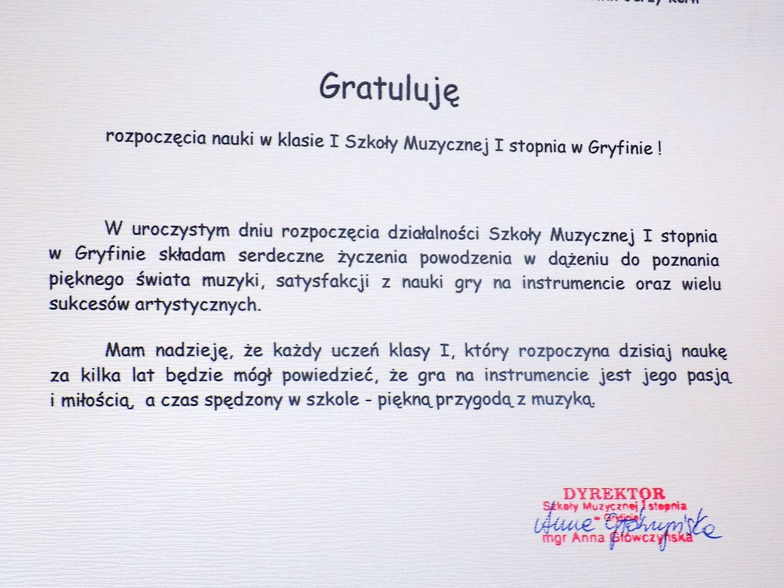 Paweł Osuchowski zaprezentował uczniów poszczególnych klas i ich nauczycieli. Najliczniejsza reprezentacja to klasa fortepianu. Pani dyrektor każdemu uczniowi wręczała listy gratulacyjne oraz zeszyty z pięciolinią. Także dyrektor Główczyńska otrzymała wiele życzeń, dobrych słów, kwiatów i zapewnień pomocy.