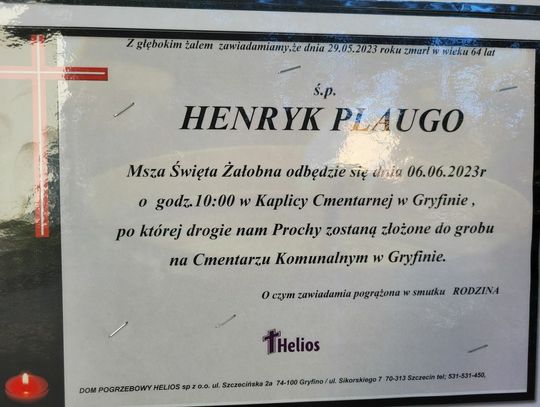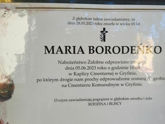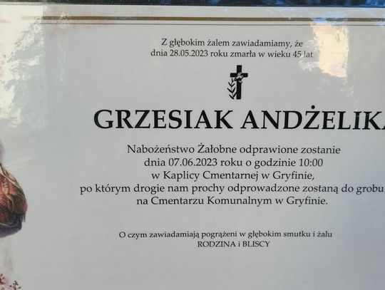 Msza św. żałobna odprawiona zostanie 7 czerwca 2023 r. o godz. 13.00 w kaplicy cmentarnej w Gryfinie.