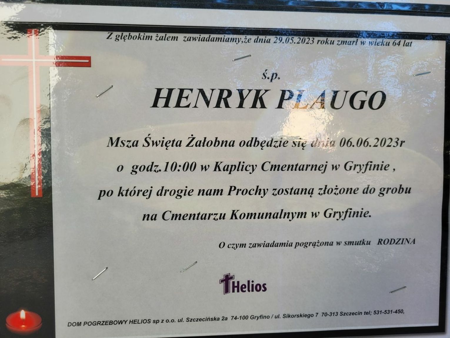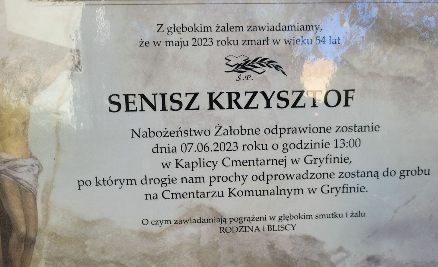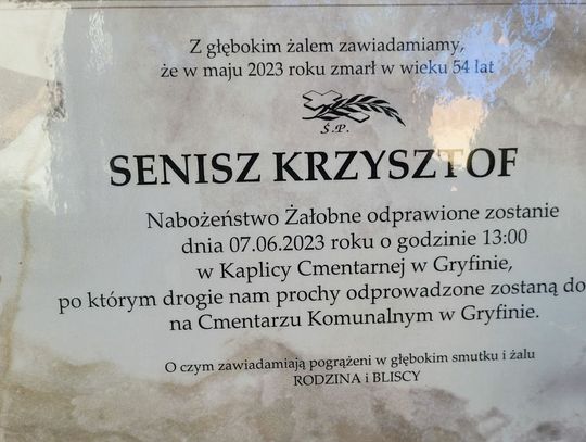 Prochy Zmarłego złożone zostaną do grobu na cmentarzu komunalnym w Gryfinie.
