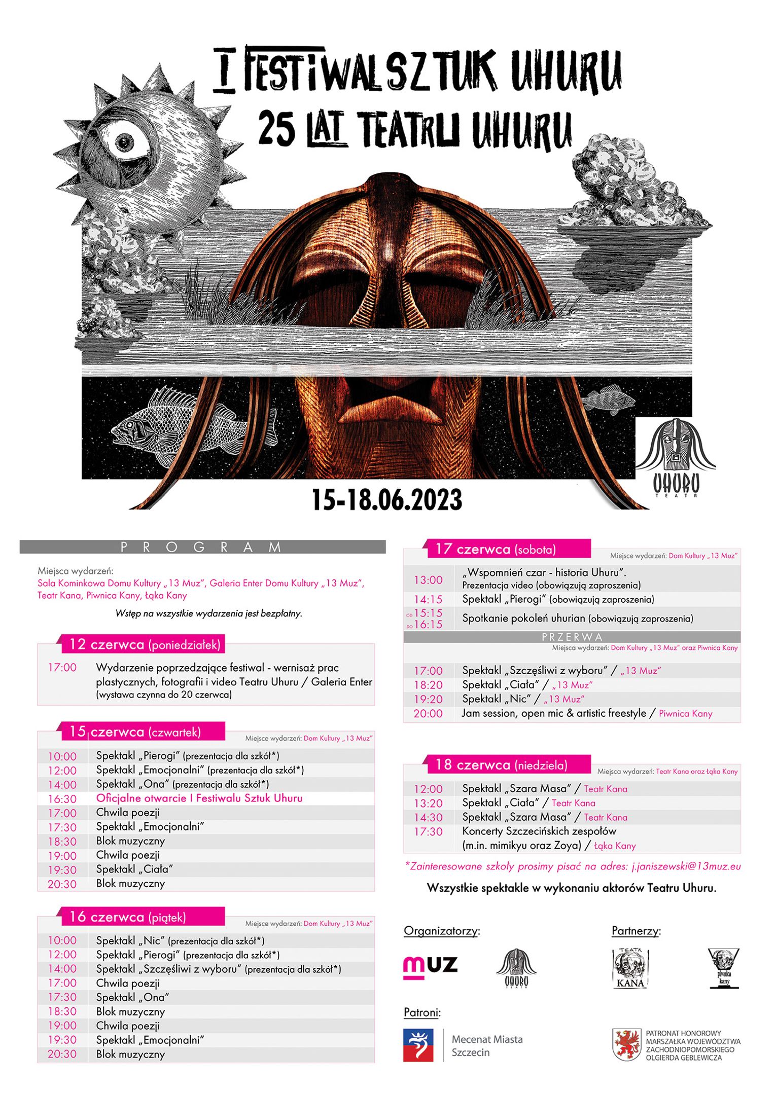 Nasza propozycja skierowana jest również do uczniów szczecińskich szkół, dzięki specjalnym porannym blokom spektaklowym, na które zapraszamy chętne do odwiedzenia nas klasy szkolne. Na naszym festiwalu proponujemy sztuki realizowane już wcześniej w Teatrze Uhuru, ale również autorskie dzieła obecnych twórców. Festiwal to czas premier tych właśnie sztuk, nad którymi nasi artyści pracowali przez cały rok.