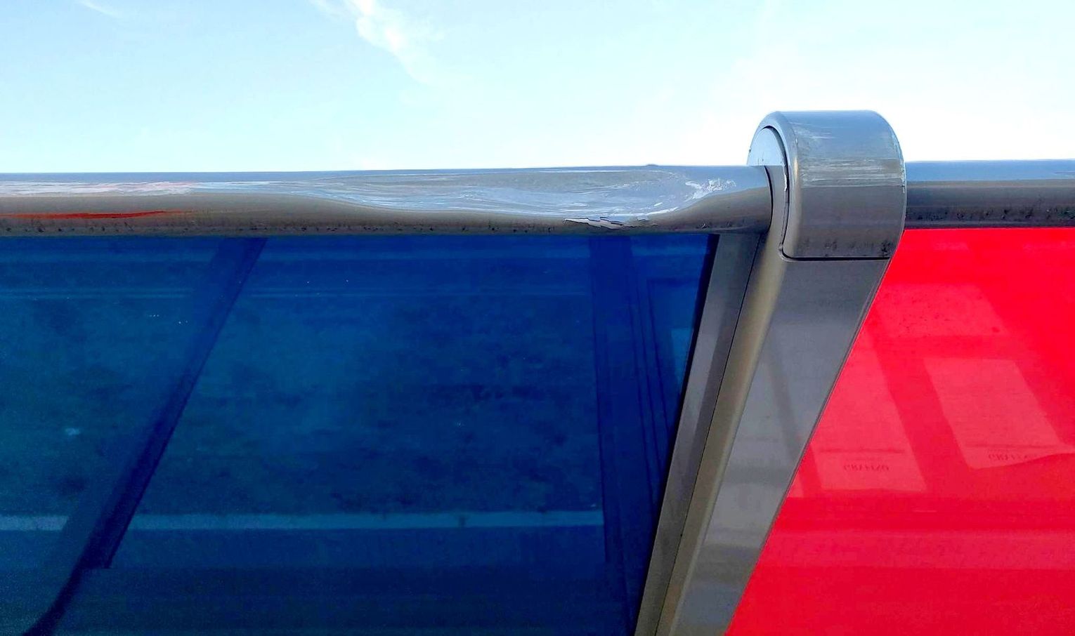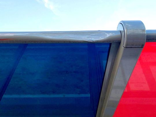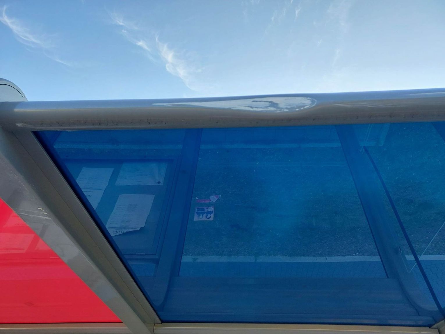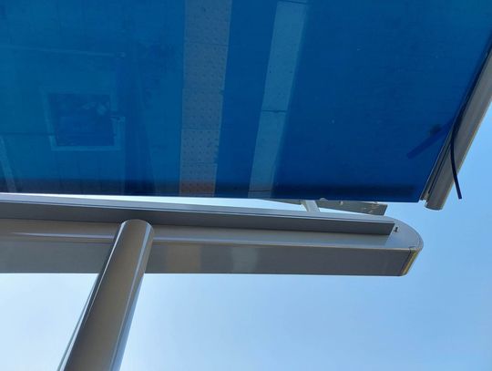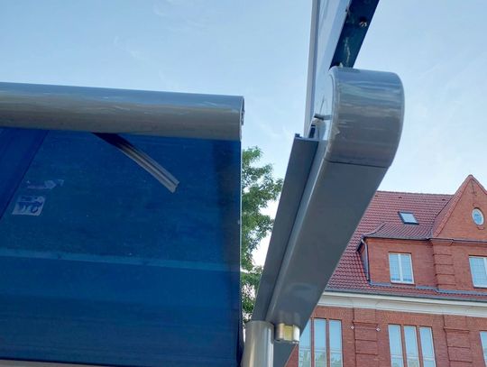 Idąc przed dworzec autobusowy zauważyłem wiszącą uszczelkę z dachu przystanku. Zaciekawiony poszedłem bliżej i wyglądało na to, że... autobus zahaczył swoim dachem o dach przystanku, powodując uszkodzenie.
