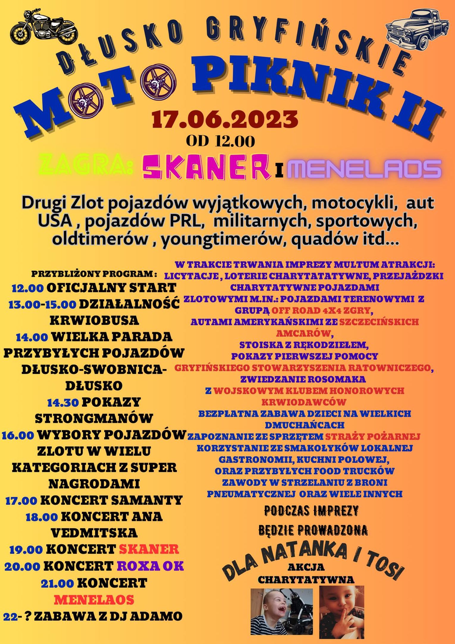 Podczas motopikniku nie zabraknie pysznych przekąsek i dań. Food trucki oraz stoiska z lokalną gastronomią będą czekały na zgłodniałych i spragnionych. Dodatkowo będzie możliwość wsparcia akcji charytatywnych, takich jak licytacje, loterie, przejazdy kucykami i pojazdami zlotowymi. Cały dochód zostanie przekazany dwójce potrzebujących dzieci - Natanowi z Dłuska i Tosi z Widuchowej.