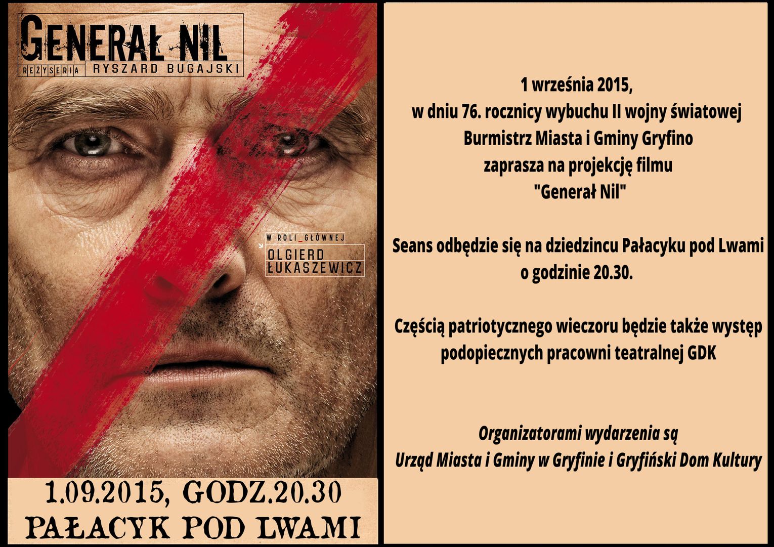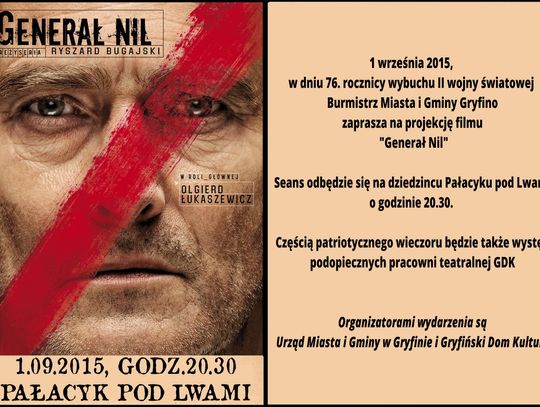 We wtorek, 1 września 2015 r. w dniu 76. rocznicy wybuchu II wojny światowej zapraszamy na projekcję filmu "Generał Nil " w reżyserii Ryszarda Bugajskiego. Seans odbędzie się na dziedzińcu Pałacyku pod Lwami o godzinie 20.30. Częścią patriotycznego wieczoru będzie także występ podopiecznych pracowni teatralnej Doroty Krutelewicz-Sobieralskiej.