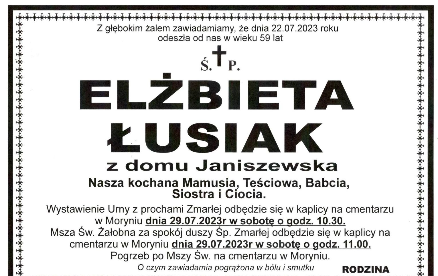 Msza św. żałobna odprawiona zostanie 29 lipca 2023 r. o godz. 11.00 w kaplicy cmentarnej w Moryniu.