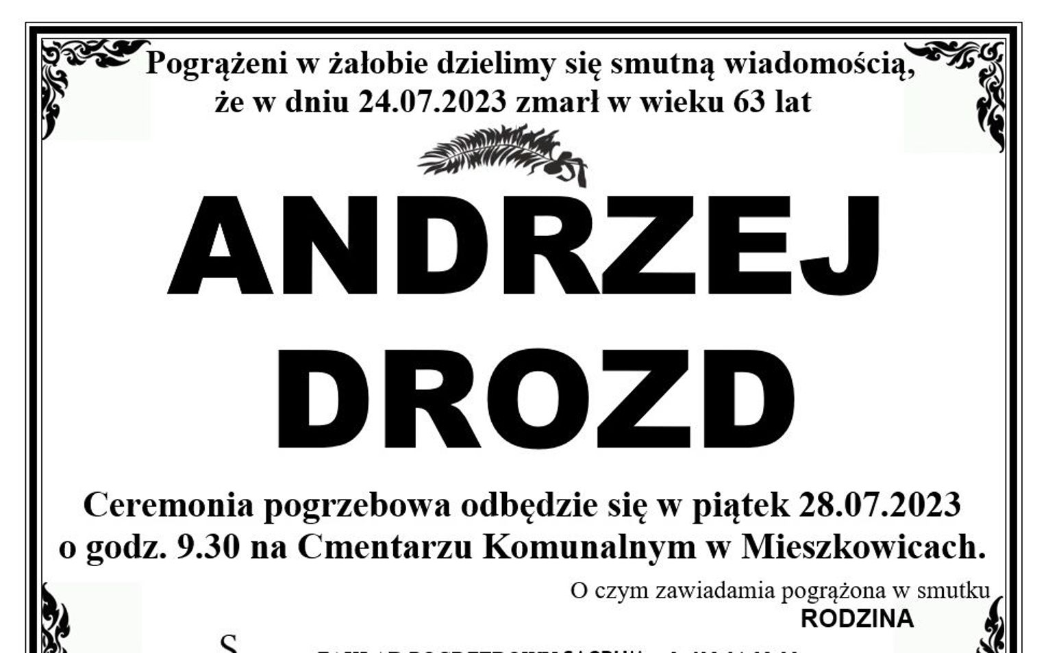 Ceremonia pogrzebowa odbędzie się 28 lipca 2023 r. o godz. 9.30 na cmentarzu komunalnym w Mieszkowicach.
