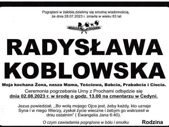 Radysława Koblowska – zmarła 28 lipca 2023 r. w wieku 83 lat