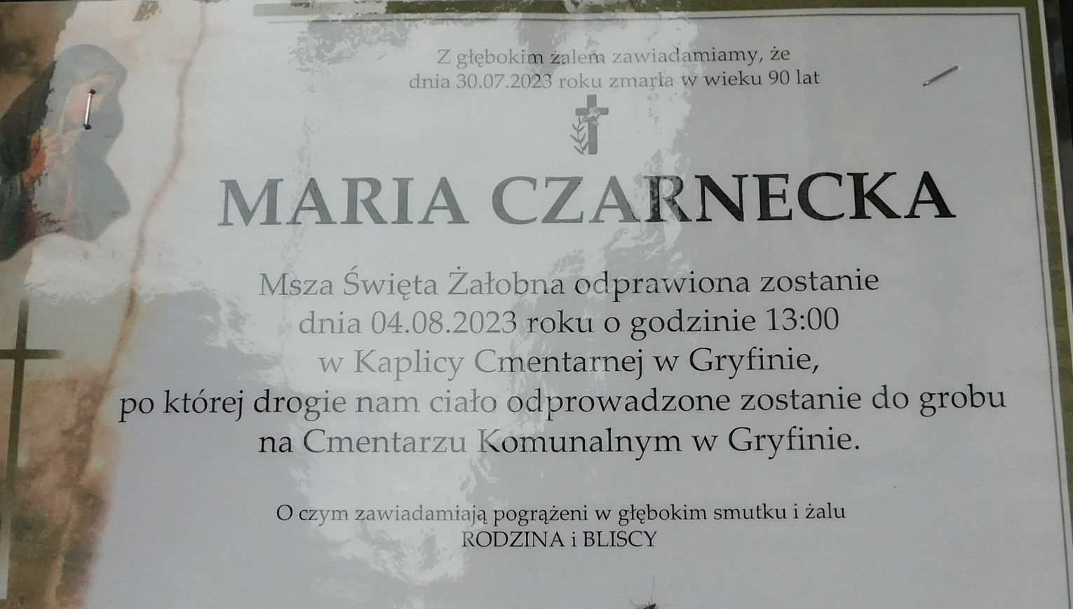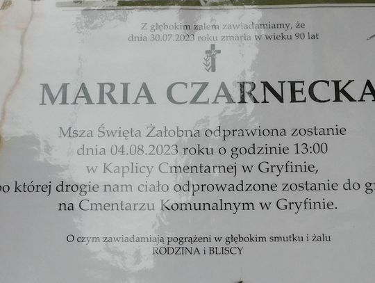 Msza św. żałobna odprawiona zostanie 4 sierpnia 2023 r. o godz. 13.00 w kaplicy cmentarnej w Gryfinie.