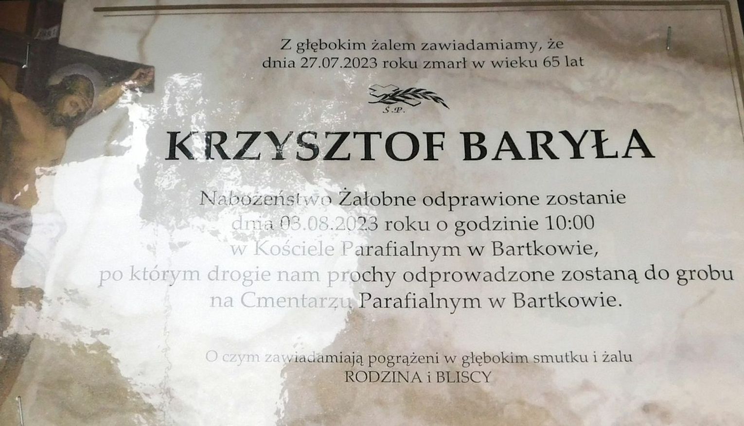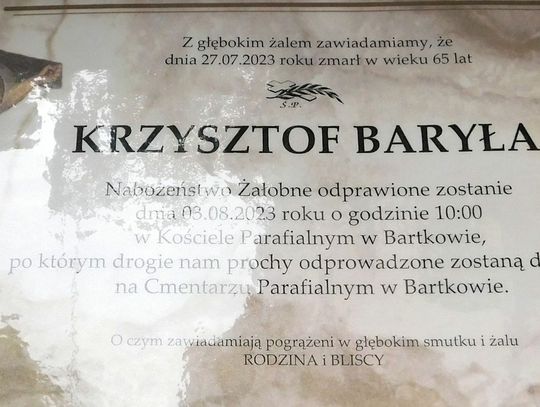 Msza św. żałobna odprawiona zostanie 3 sierpnia 2023 r. o godz. 10.00 w kościele w Bartkowie