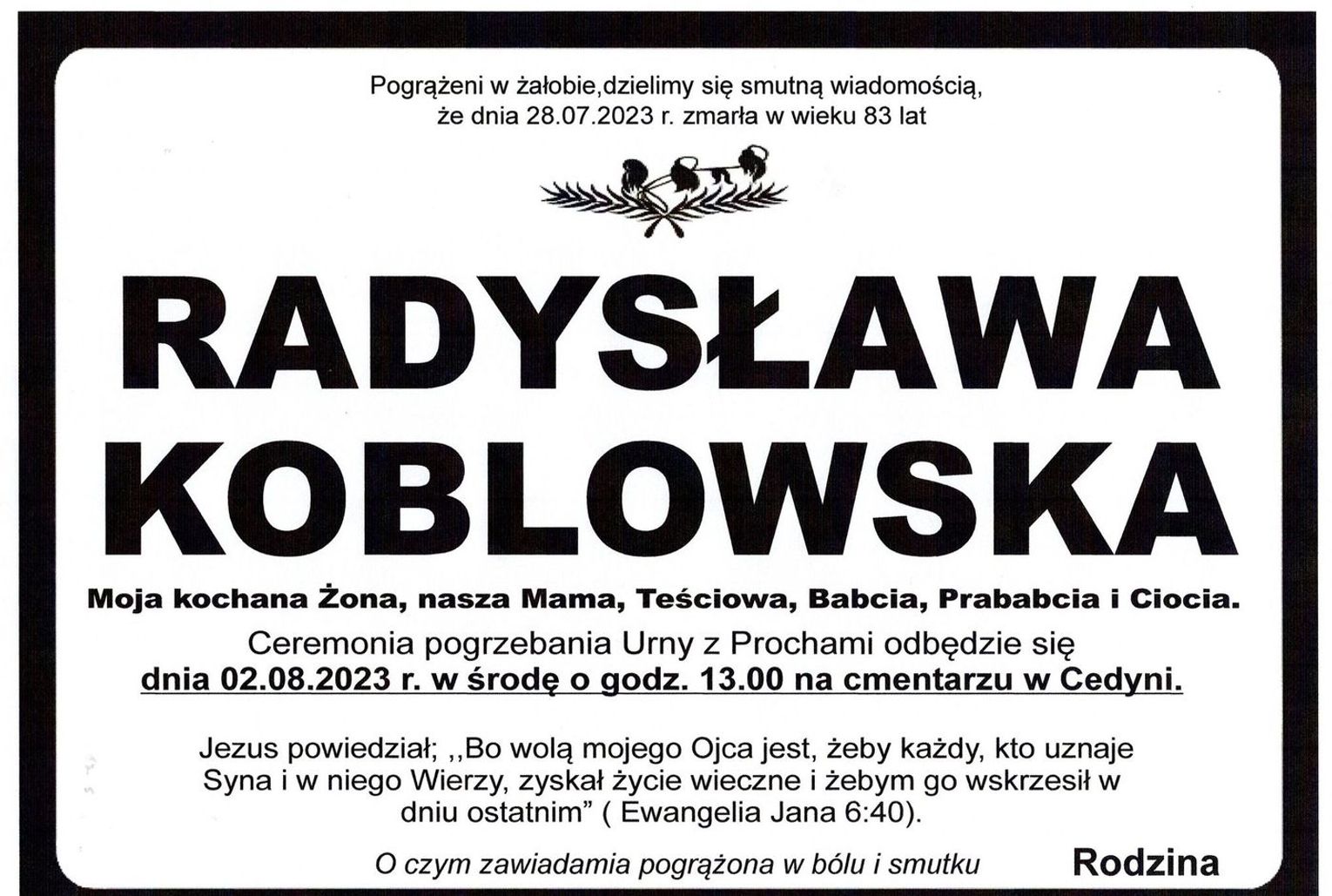 Ceremonia pogrzebania urny z prochami odbędzie się 2 sierpnia 2023 r. o godz. 13.00 na cmentarzu w Cedyni.