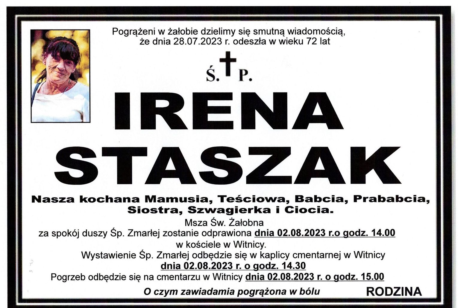 Msza św. żałobna odprawiona zostanie 2 sierpnia 2023 r. o godz. 14.00 w kościele w Witnicy.