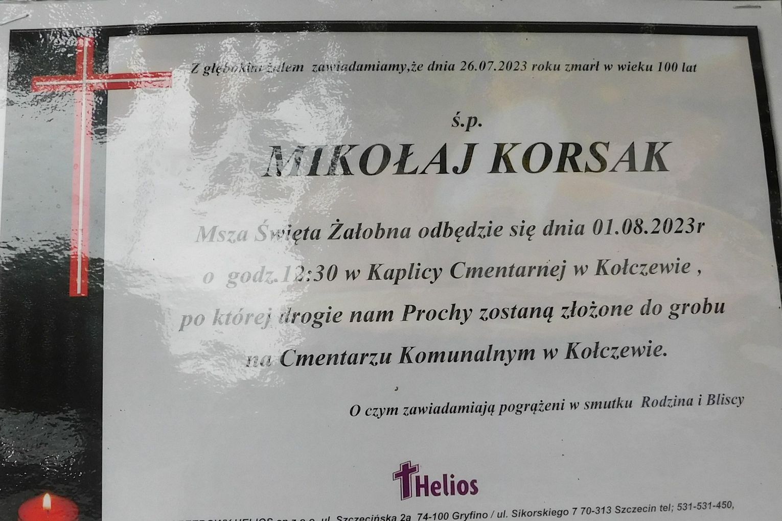 Msza św. żałobna odprawiona zostanie 1 sierpnia 2023 r. o godz. 12.30 w kaplicy cmentarnej w Kołczewie.