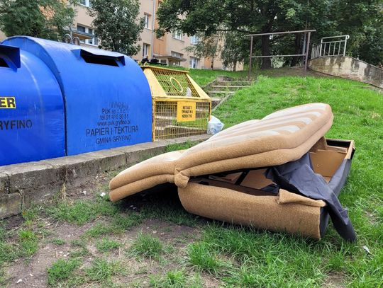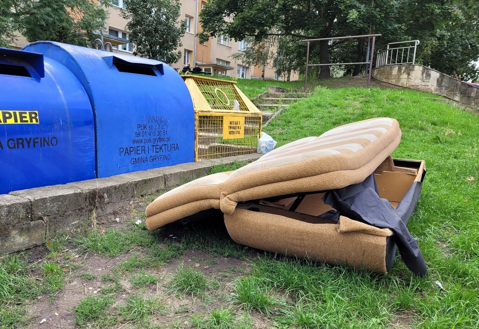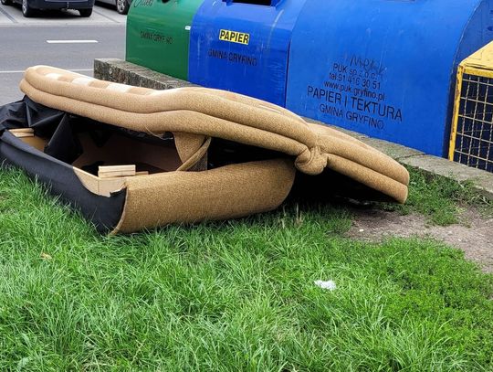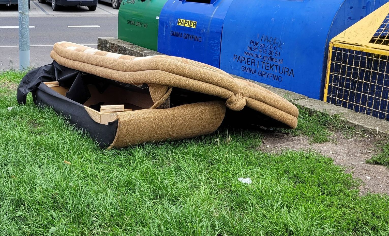 Rozwalony tapczan leży na skrzyżowaniu ulic Krasińskiego i Iwaszkiewicza w Gryfinie. Leczy jakby ktoś wyrzucił go z balkonu.