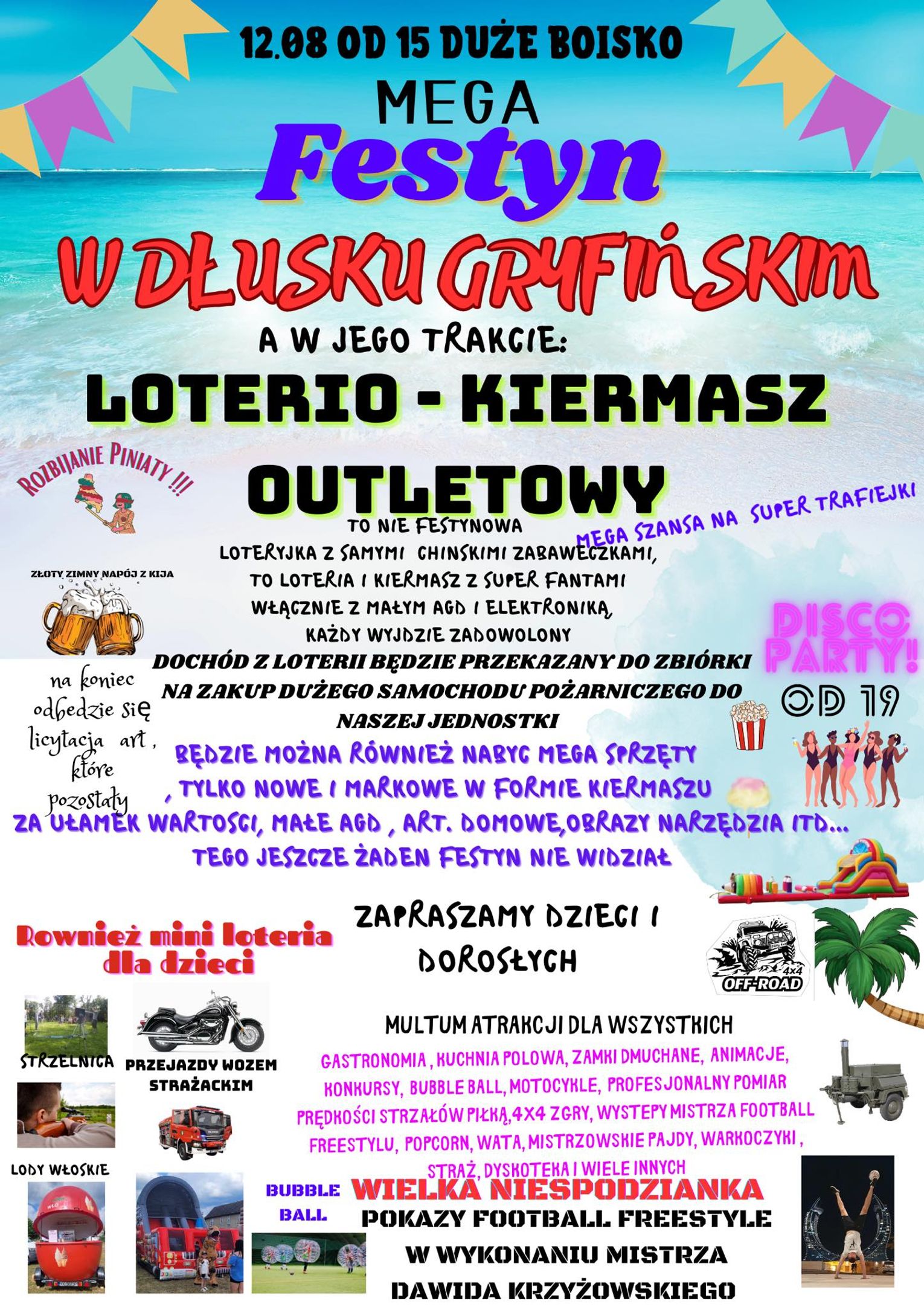Wyjątkowy festyn w Dłusku Gryfińskim nie będzie dotyczył jedynie piłki nożnej. To otwarte wydarzenie dla całych rodzin, które połączy outletowy loterio-kiermasz. Będzie można wygrać lub nabyć gadżety, sprzęty domowe, obrazy, a także produkty audio zachodnich marek i wiele innych wartościowych przedmiotów. Na zakończenie odbędzie się aukcja, podczas której będzie można wylicytować różnorodne sprzęty.