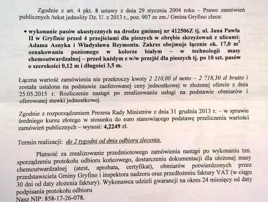 6. Odpowiedź Ad4 również jest niespójna ze stanem faktycznym. Zapytanie do Generalnego Wykonawcy drogi w sprawie progów zwalniających wystosowano 22.05.2015. Zlecenie montażu pasów akustycznych datowane jest na dzień 26.05.2015. Wcześniej musiano zgodnie z przytaczaną procedurą wystąpić do innych wykonawców tych rozwiązań z zapytaniem ofertowym, aby wybrać najkorzystniejszą ofertę. Trudno zatem zgodzić się z wyjaśnieniem jakoby to czas odpowiedzi na wniosek UMiG Gryfino do Generalnego Wykonawcy drogi był przesłanką do zastosowania „alternatywnego” rozwiązania w postaci pasów akustycznych.