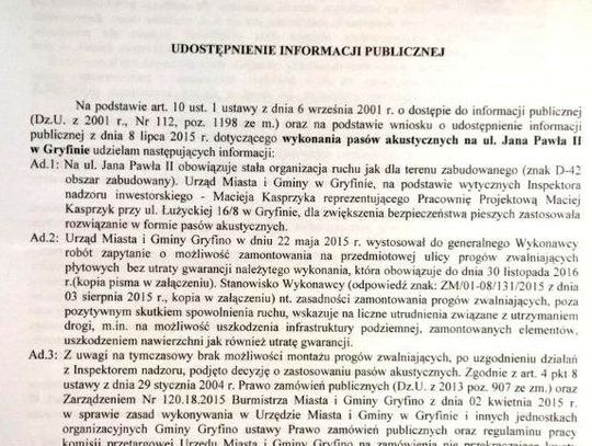 Podsumowując – wypowiedź zastępcy burmistrza Tomasza Milera z dn. 17.07.2015 (wydanie dyspozycji dot. usunięcia pasów akustycznych), stanowisko z załączonego pisma z dn. 6.08.2015 (informacja, że pasy akustyczne są właściwym rozwiązaniem) oraz wypowiedź dla igryfino.pl (trwa analiza kosztowa zakupu progów, które zastąpią pasy akustyczne) to stanowiska, które się wzajemnie wykluczają.