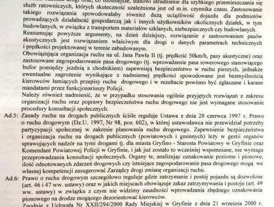 Pragnę powrócić do tematu pasów akustycznych, a właściwie bezpieczeństwa mieszkańców i użytkowników drogi w związku z zagrożeniami, jakie wynikają z notorycznie popełnianych przez kierowców wykroczeń w ruchu drogowym tj. przekroczeń prędkości na ul. Jana Pawła II w Gryfinie.