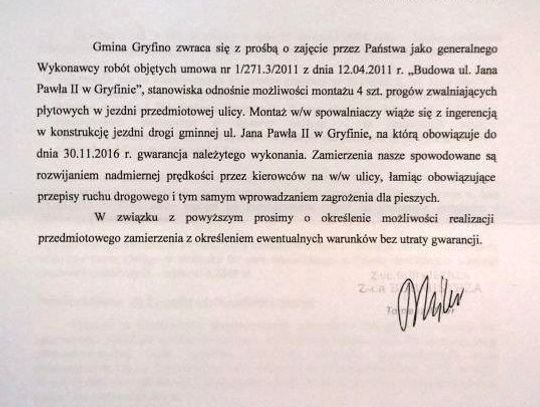 Na wstępie dziękuję wszystkim osobom zaangażowanym i popierającym inicjatywę zawartą we wniosku z dnia 3 maja 2015 roku skierowanym do Urzędu Miasta i Gminy Gryfino o montaż progów zwalniających na ul. Jana Pawła II w Gryfinie.
