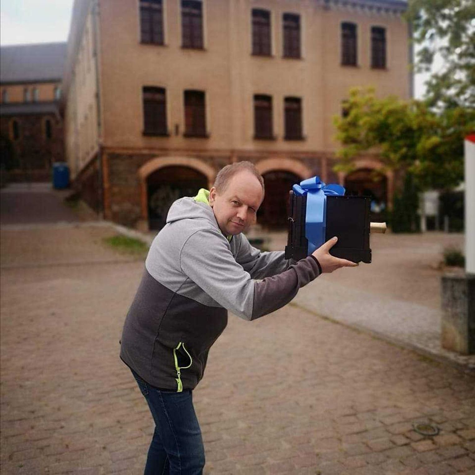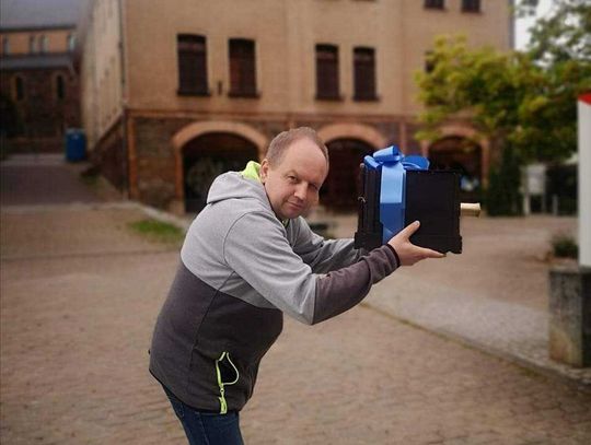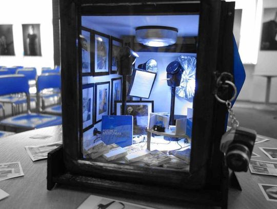 Kolejna praca również na zdjęciach to prezent dla Andrzeja Łazowskiego - artysty fotografika ze Szczecina, który obchodził 25-lecie swojej działalności artystycznej. Prezent to replika pierwszego aparatu fotograficznego.
