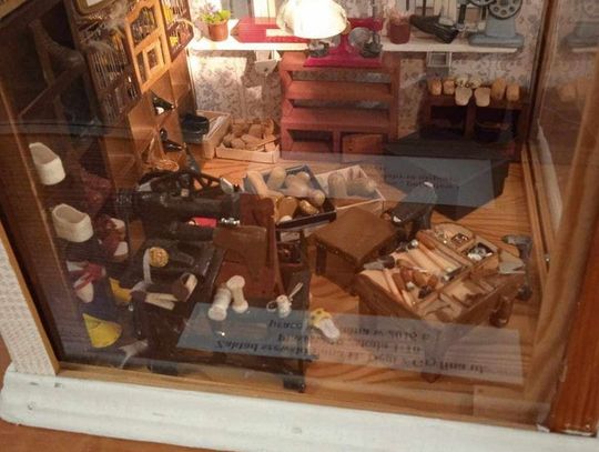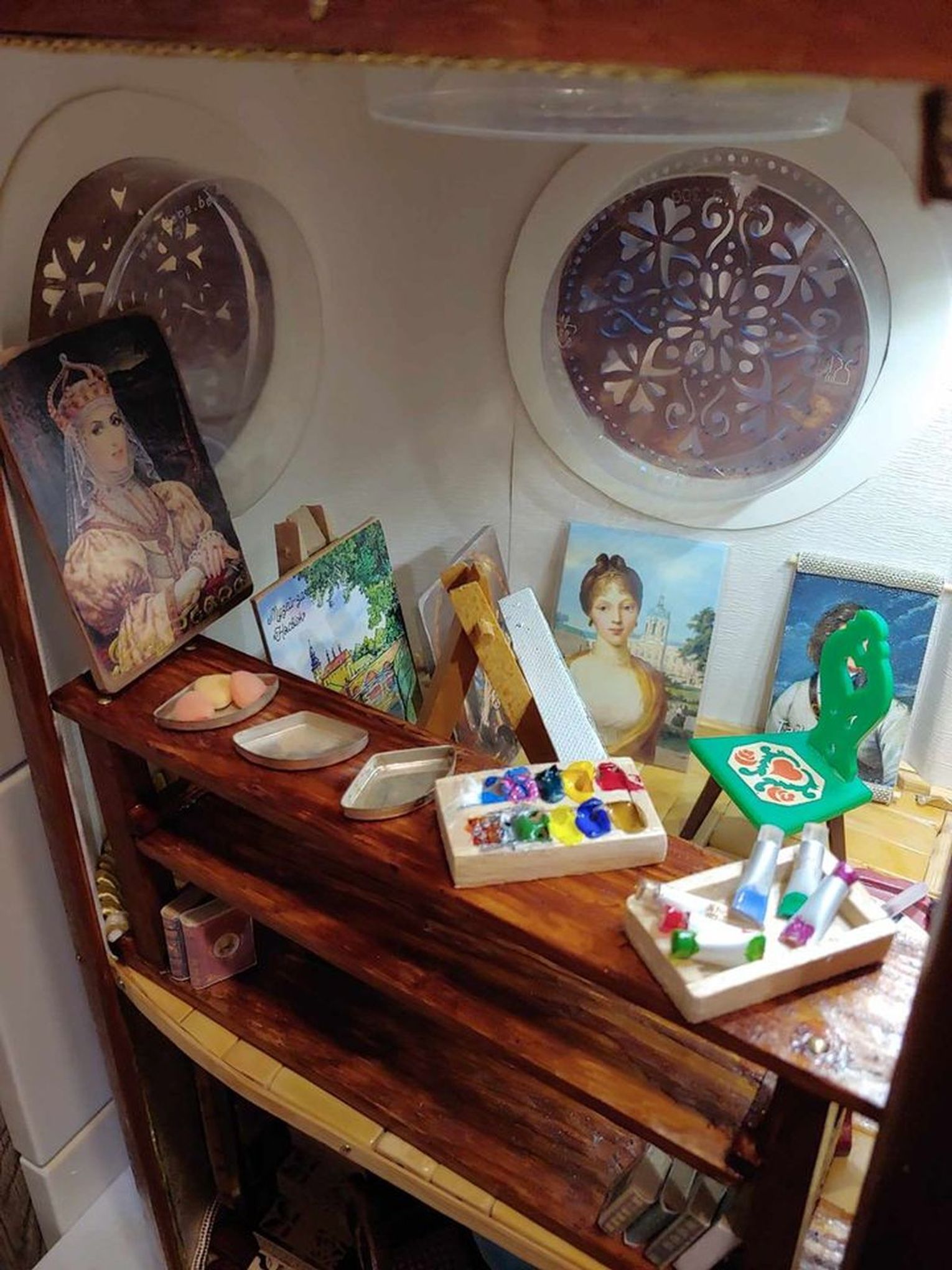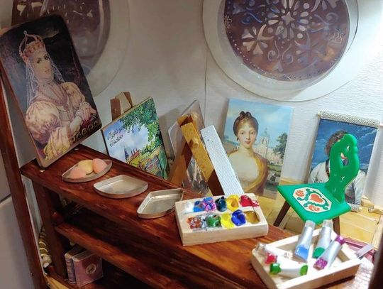 Kolejną nową pracą, którą pokaże na wystawie jest „Pracownia malarza artysty” zrobiona w... drewnianej pokrywie od maszyny do szycia.