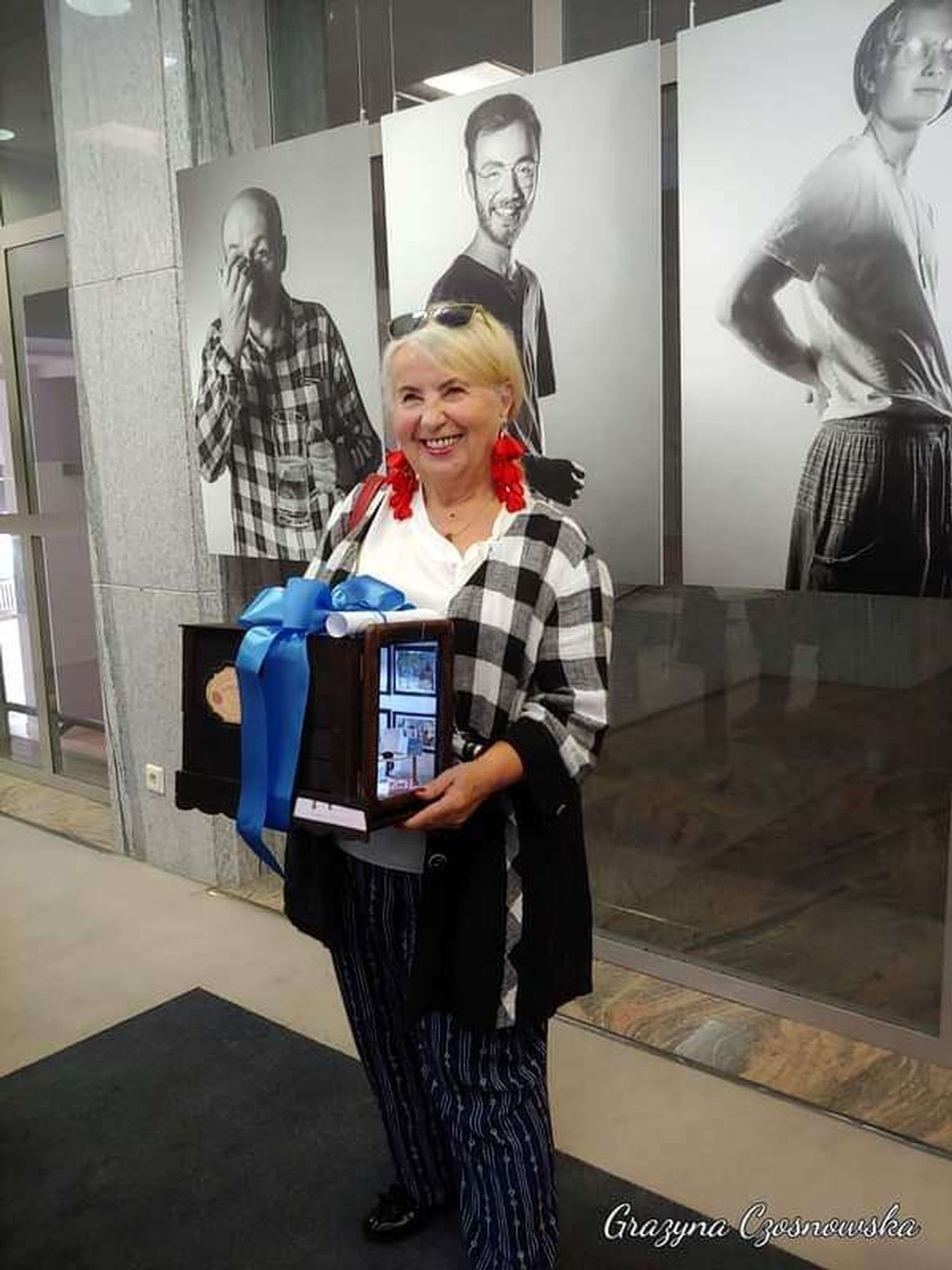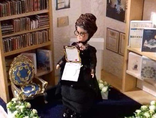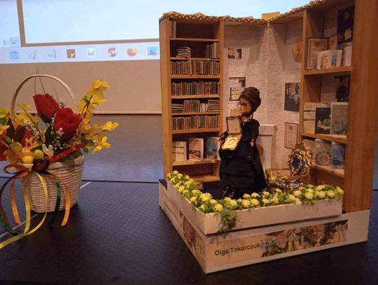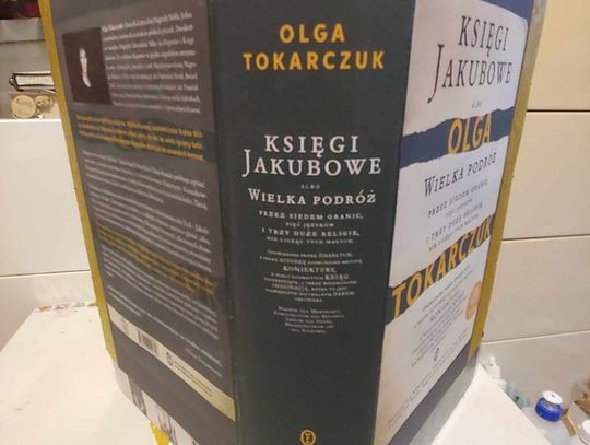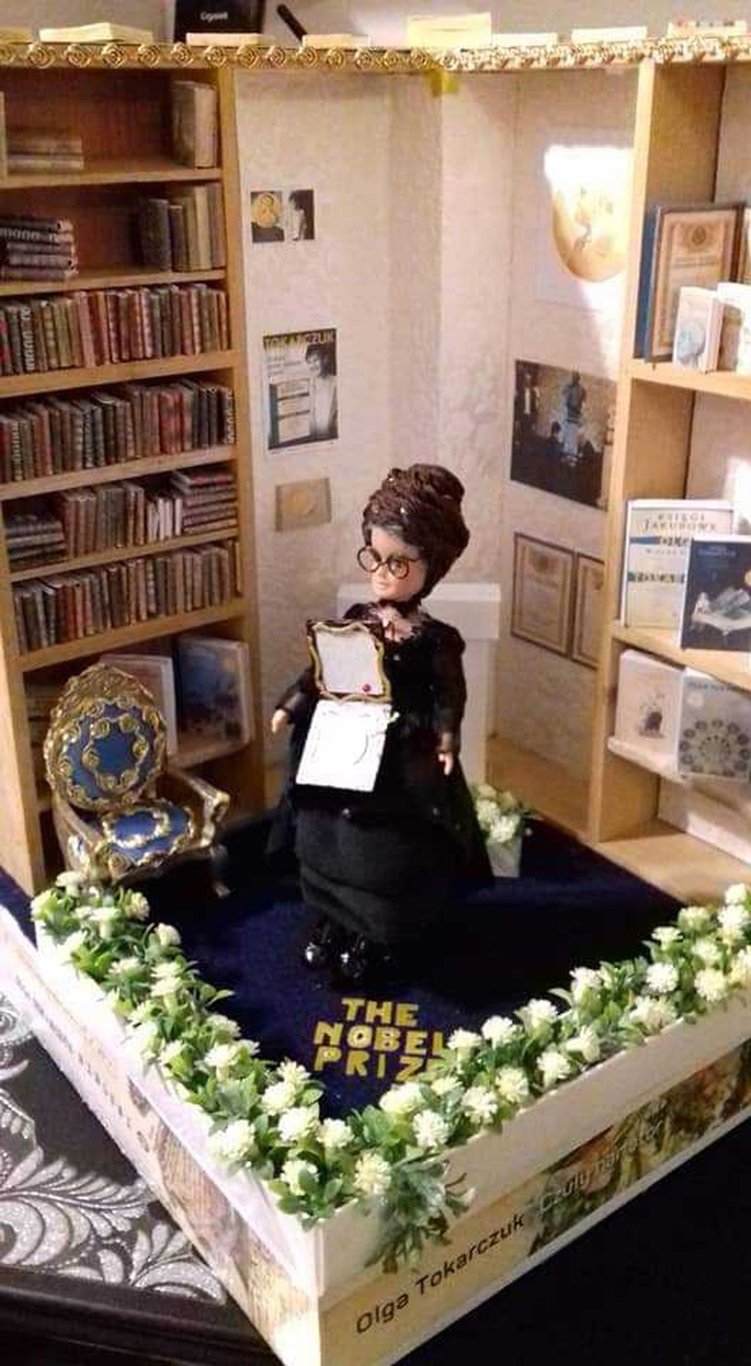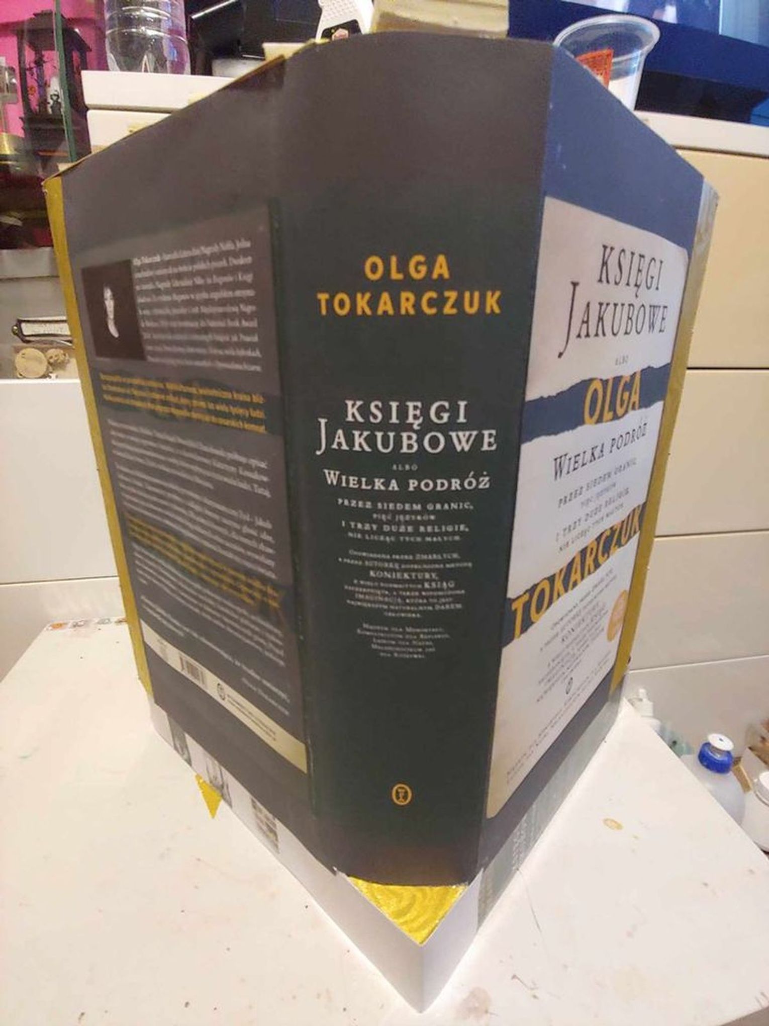 Prezent, na którym jest Olga Tolarczuk odbierająca Nagrodę Nobla. Prezent jest w postaci otwartej powieści Księgi Jakubowe. Na wystawie będą tylko zdjęcia.