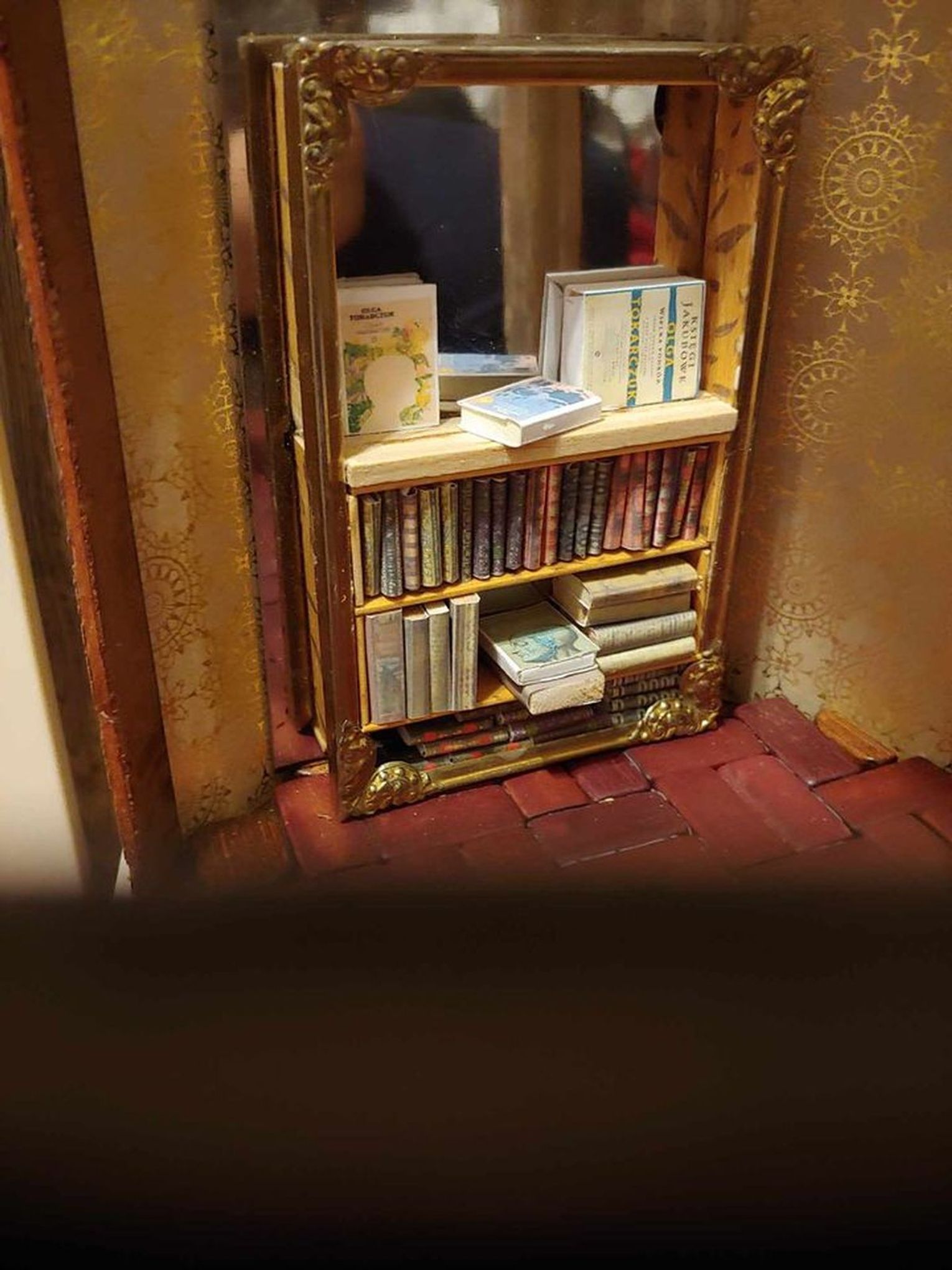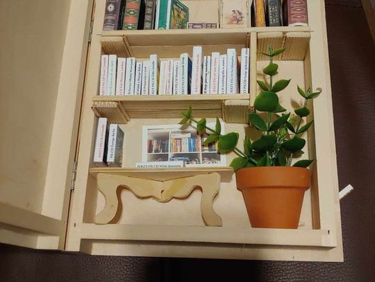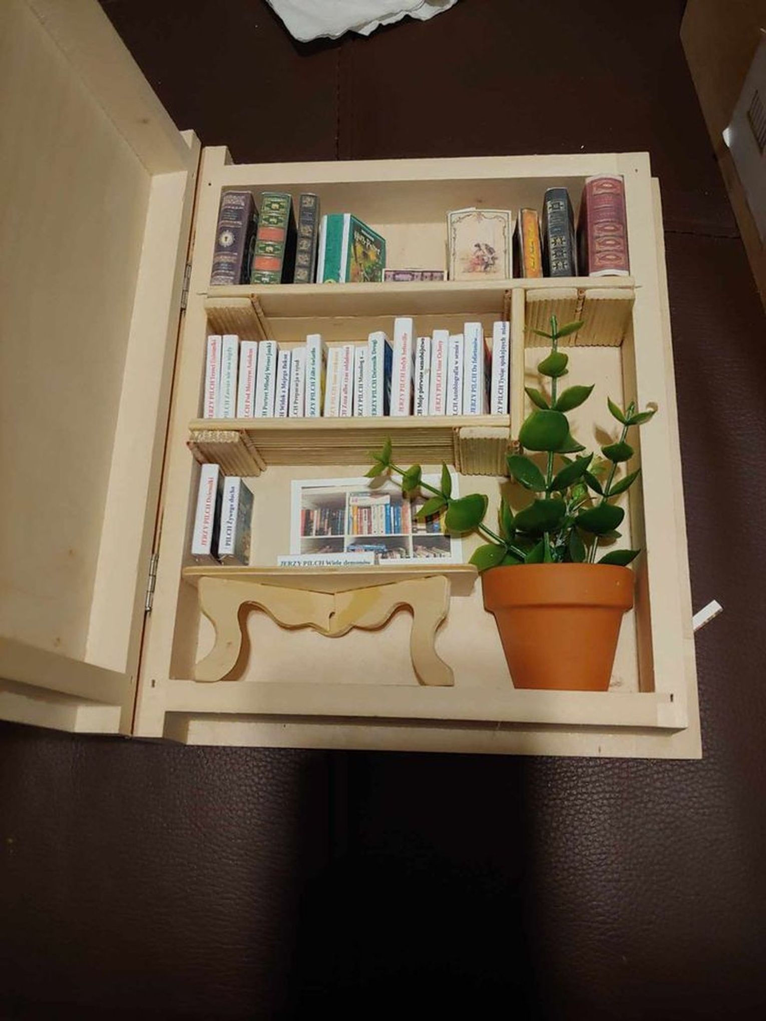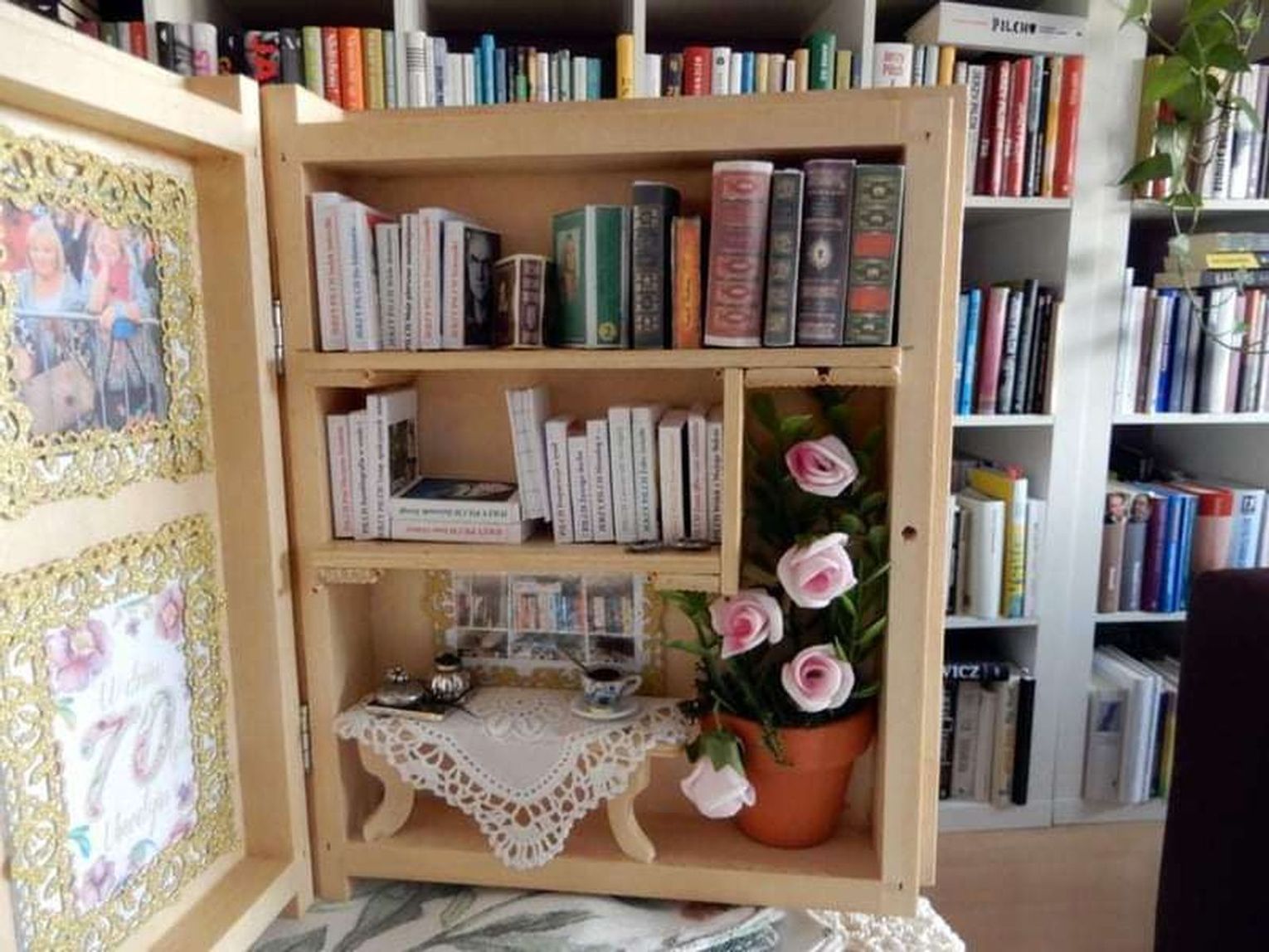 Następna praca, która będzie tylko w postaci zdjęć, to prezent urodzinowy dla koleżanki „Książka zawierająca bibliotekę z książkami Jerzego Pilcha".