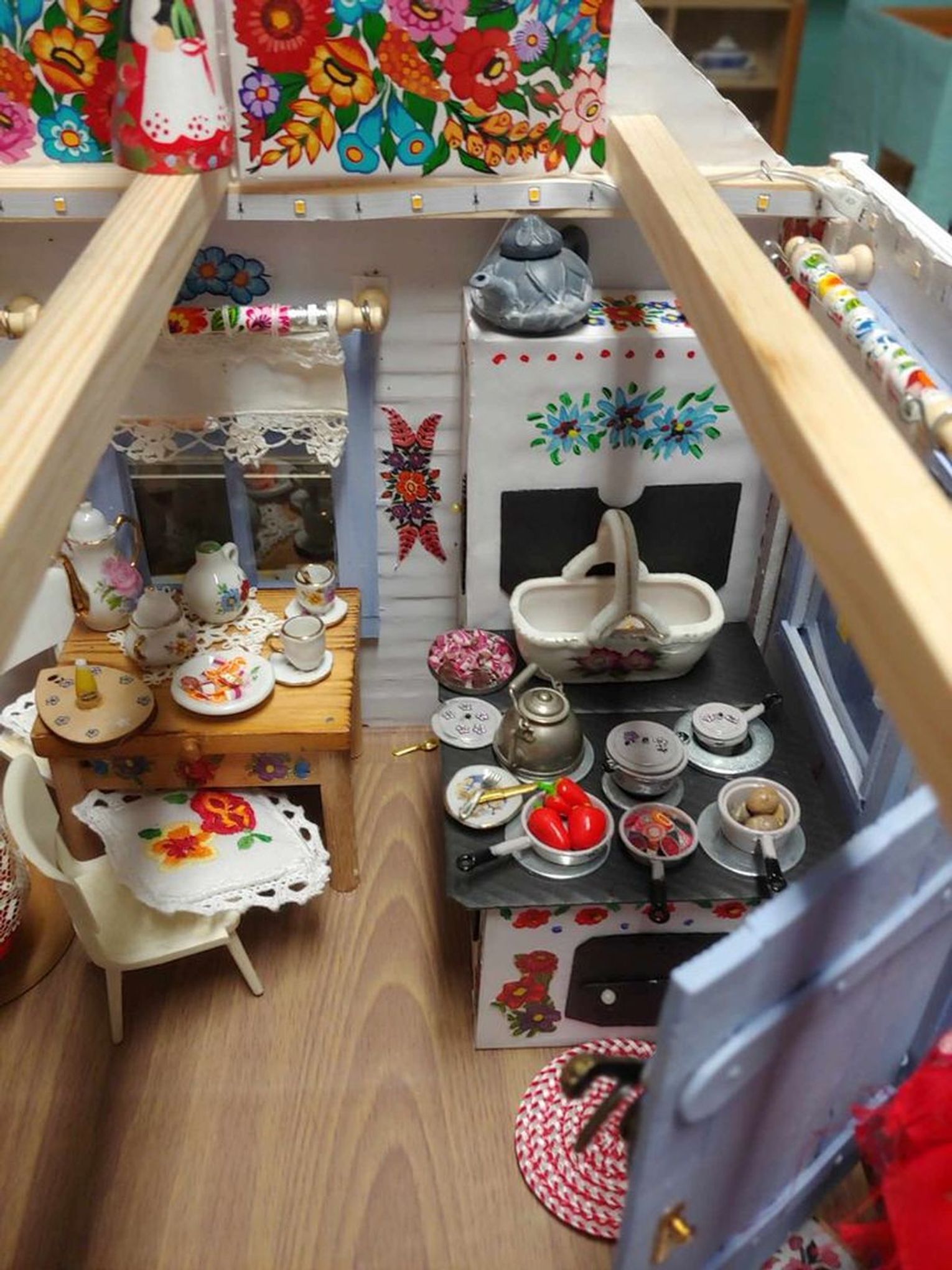 Pomysł zrobienia chatki podała mi córka mówiąc, że przecież u nas w Gryfinie też jest Zalipie. Zasięgnęłam języka skąd ono i dlaczego u nas. Otóż były prezes PSS Gryfino pan Marian Tessar zaprosił z Zalipia 4 panie, które swoimi pracami malarskimi ozdobiły wnętrza budynku i restaurację. Obecnie w restauracji już tych malowideł nie ma. Budowa zalipiańskiej chatki sprawiła mi wielką przyjemność, gdyż jest taka kolorowa, a kolory to mój żywioł.
