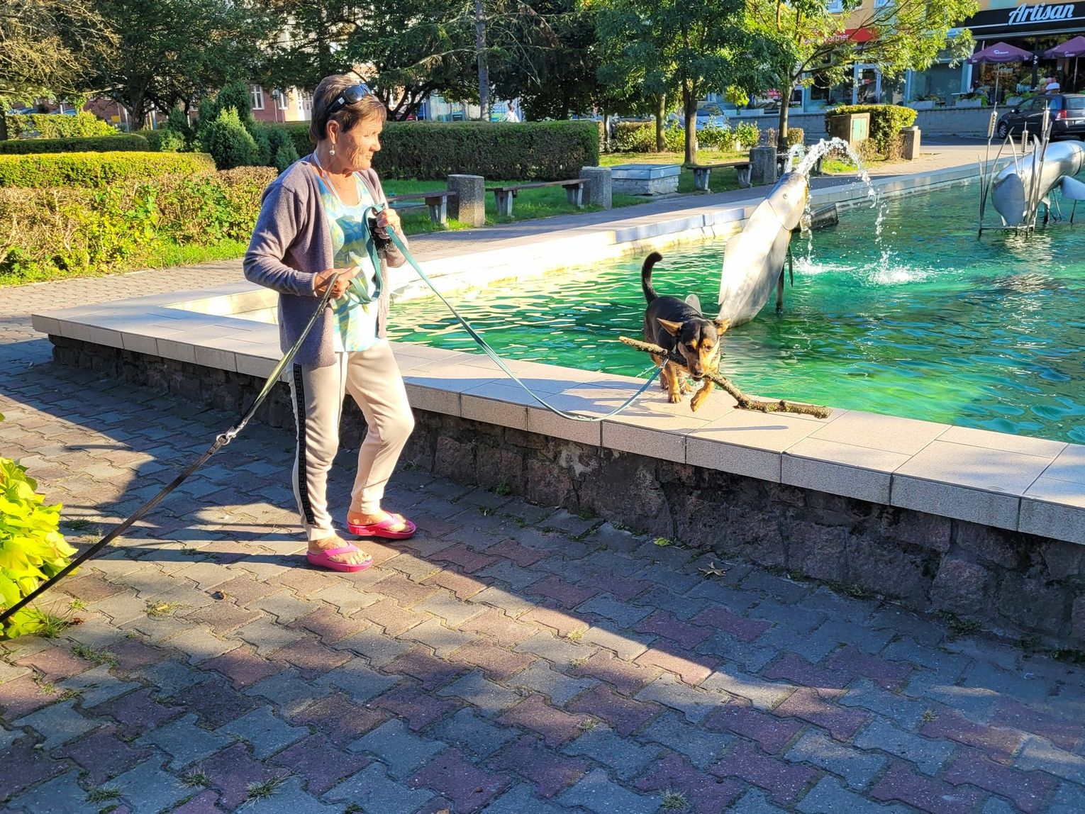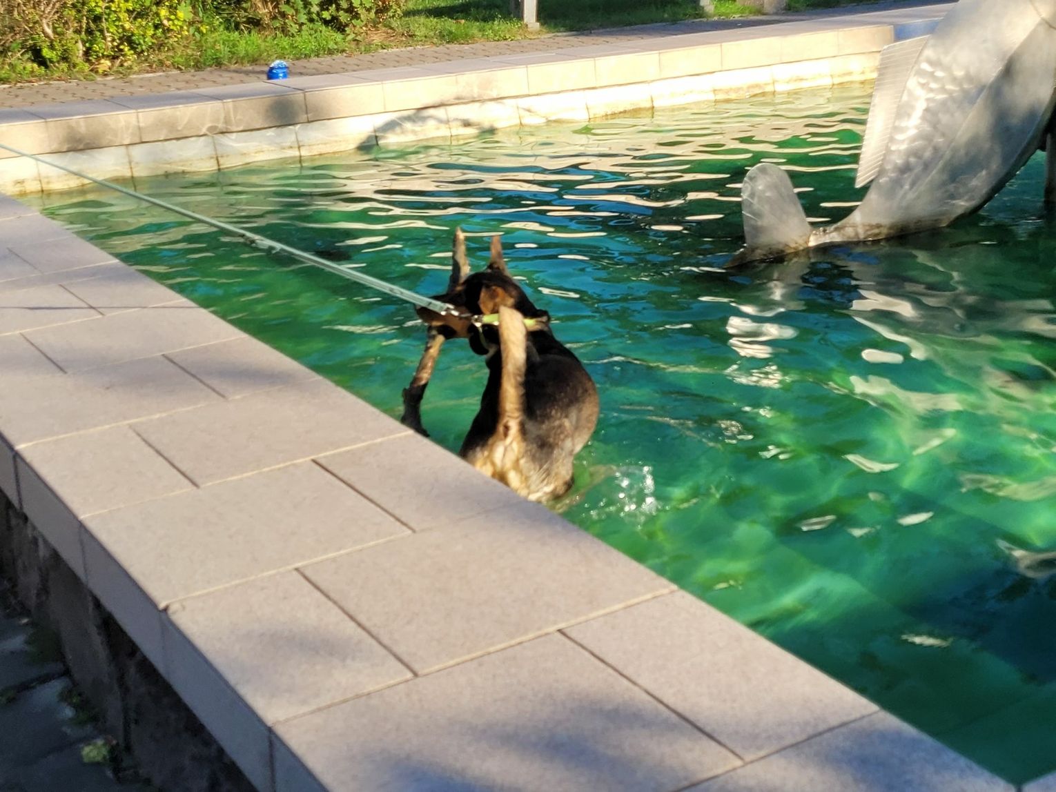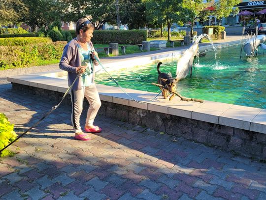 Mieszkanka Gryfina wyszła dzisiaj po południu ze swoimi dwoma psami na spacer. Połowa września, sobota, na termometrze aż 25 stopni. Nagle przy fontannie jeden z psów wyrywa się na smyczy. Trudno go utrzymać, tak chce wskoczyć do wody. Udaje się! Na dodatek można wyłowić łup - gałąź. Piesek jest naprawdę szczęśliwy! Dumny wyskakuje z fontanny ze złowionym łupem.