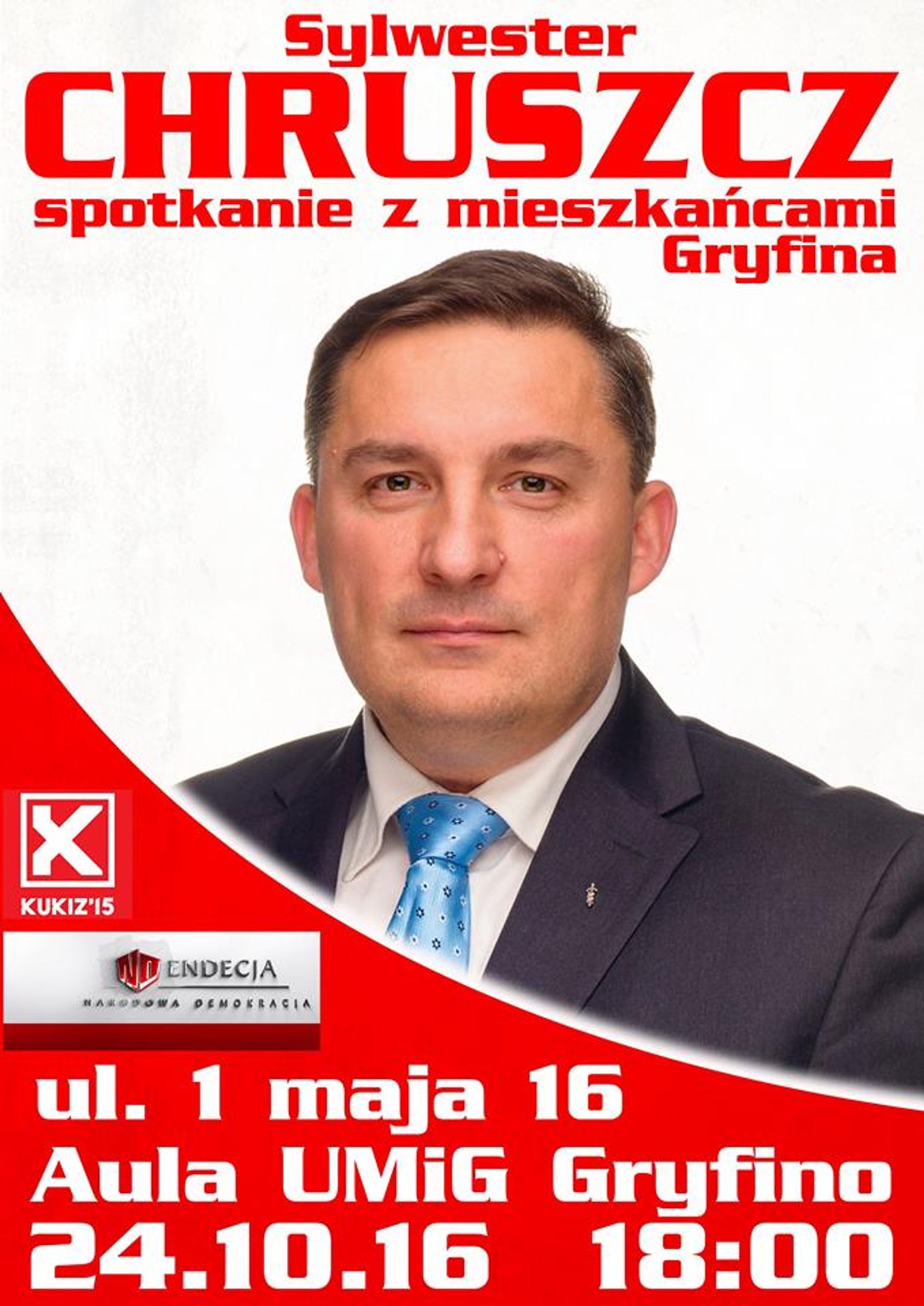 W poniedziałek, 24 października 2016 o godz.18.00 w auli Urzędu Miasta i Gminy Gryfino odbędzie się spotkanie z Sylwestrem Chruszczem, posłem Kukiz'15. -Tematem wizyty będzie aktualna sytuacja polityczna w kraju oraz działalność parlamentarna posła Chruszcza jako reprezentanta Pomorza Zachodniego – informuje Marcin Sajniak.