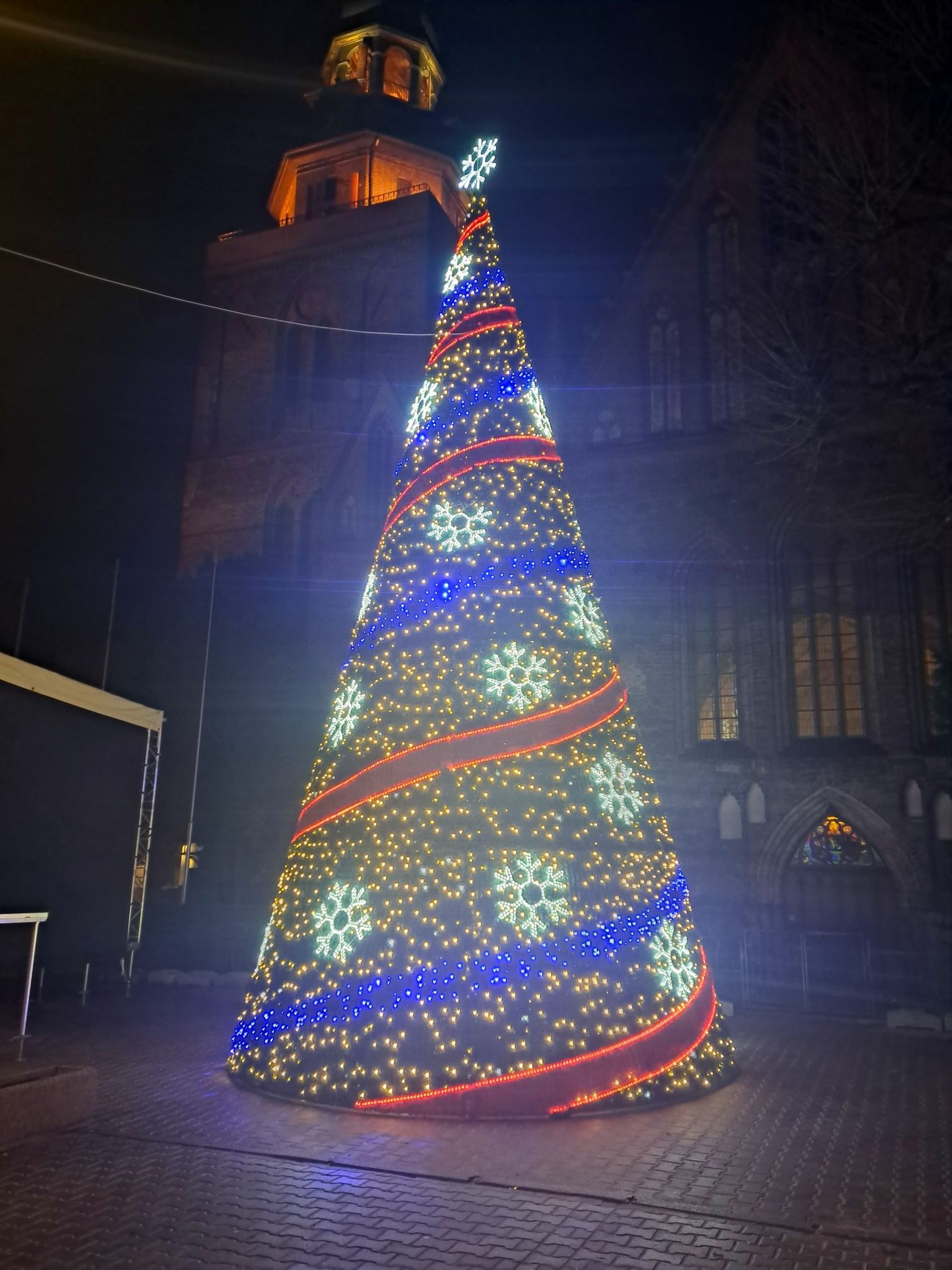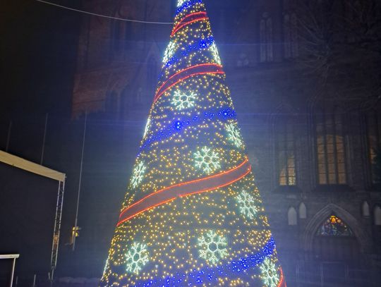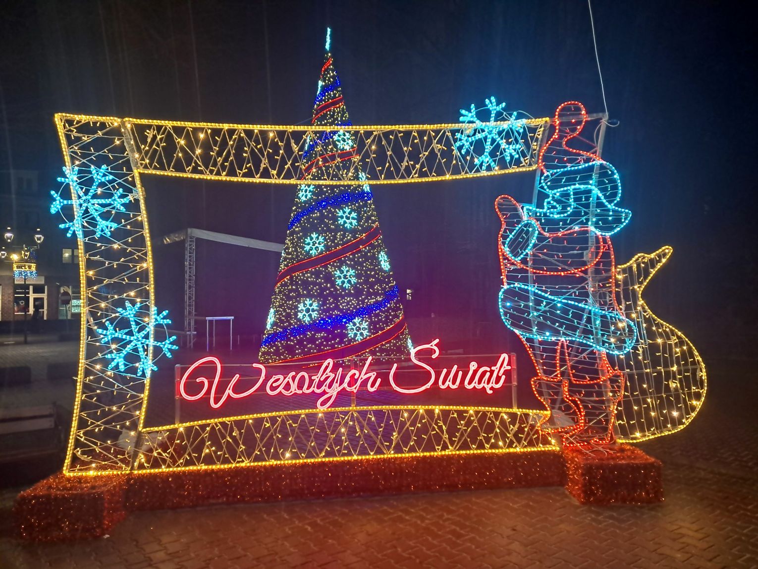 Są śnieżynki, wesoły bałwanek, gwiazdki, świetlne łańcuchy, girlandy i kolorowe napisy. Główny plac starego miasta wygląda bajecznie.