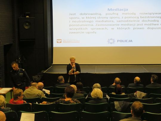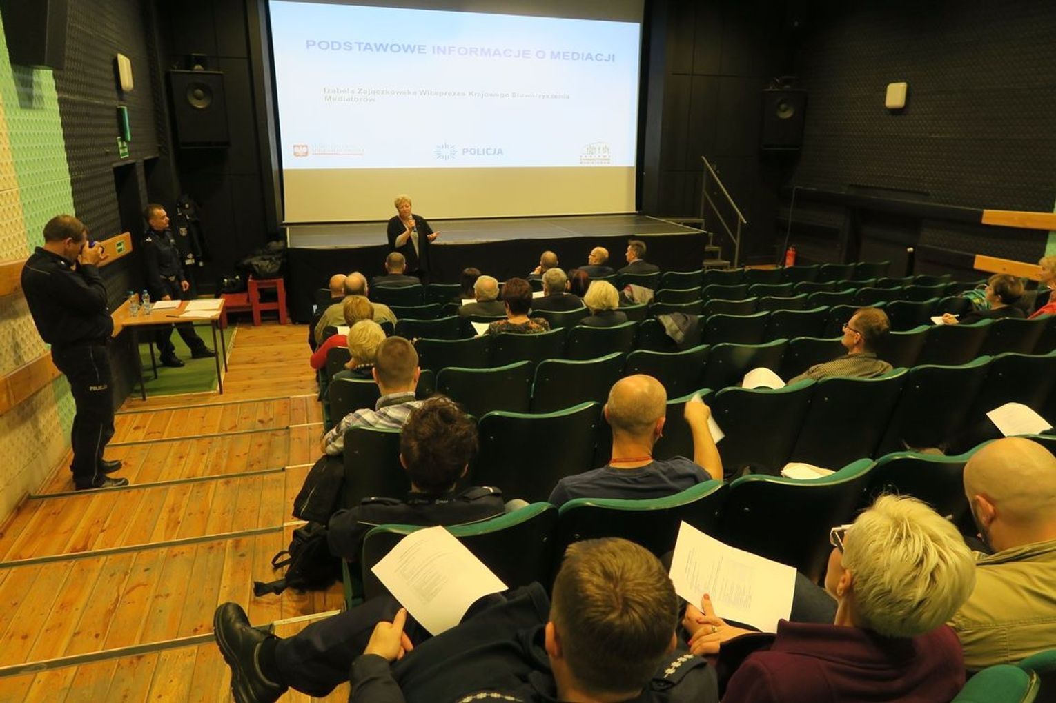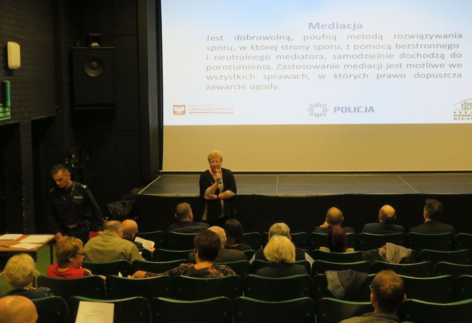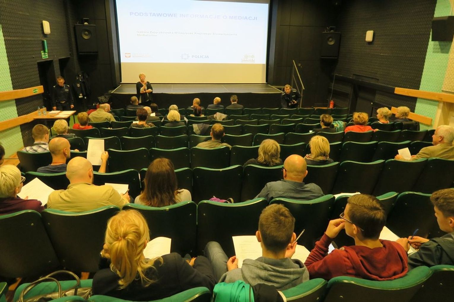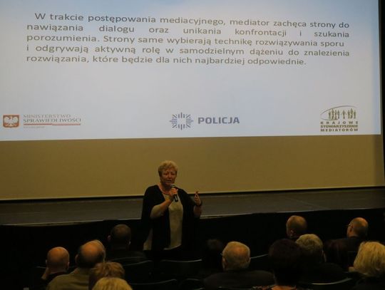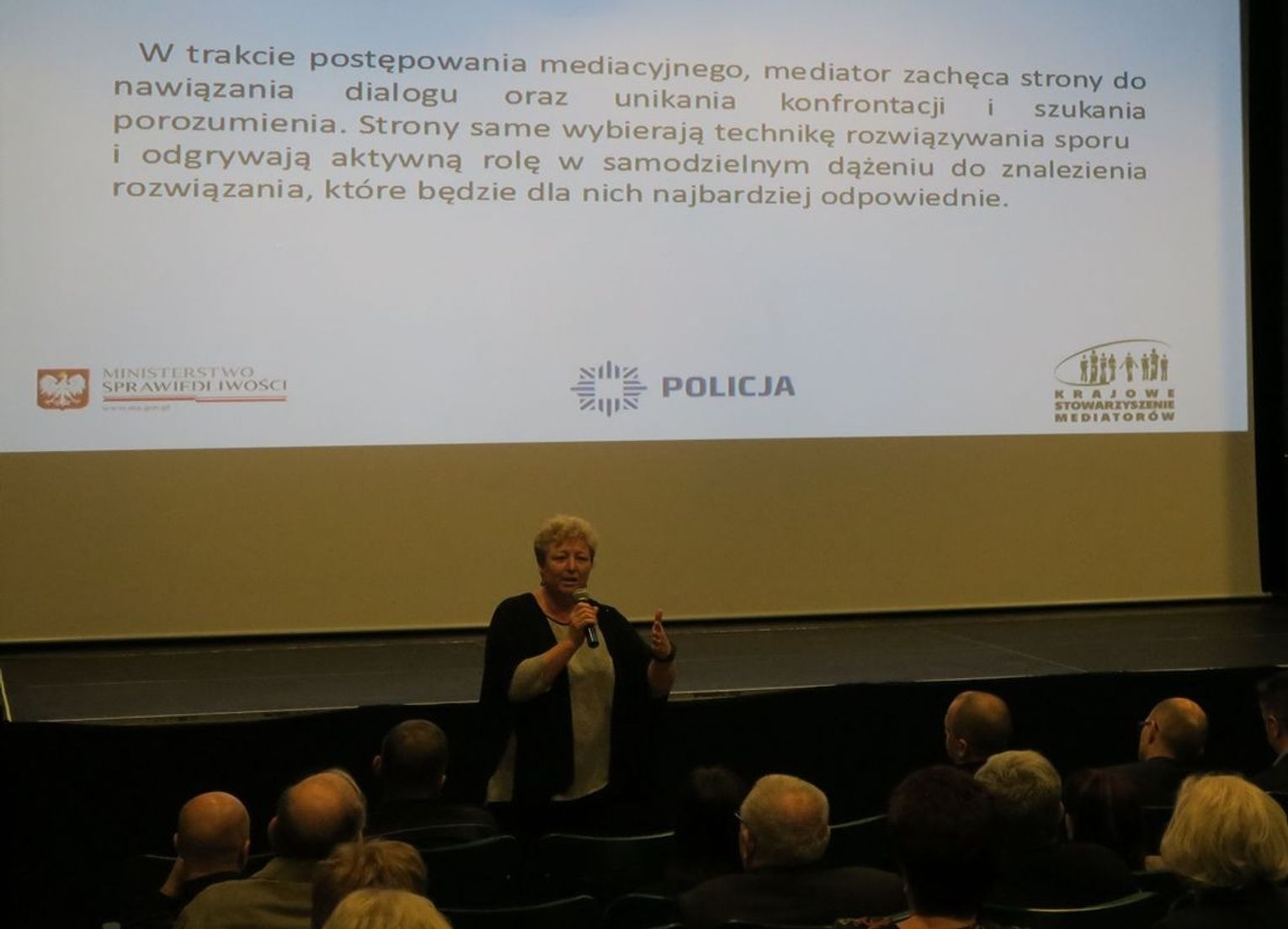 Izabela Zajączkowska mówiła o zasadach mediacji. –Najważniejszą sprawą w mediacji jest poufność – powiedziała Zajączkowska. Po kilku wystąpieniach wywiązała się dyskusja. Mediator z Chojny zachęcała aby z ofertą prowadzenia mediacji „wyjść na ulice”. Na pytania odpowiadał też prokurator Radosław Grabusiński. Natomiast o mediacjach w sprawach nieletnich mówił podkomisarz Robert Panna, zastępca wydziału prewencji ruchu drogowego. Debatę i dyskusję prowadził podinsp. Janusz Osicki, naczelnik Wydziału Prewencji i Ruchu Drogowego.