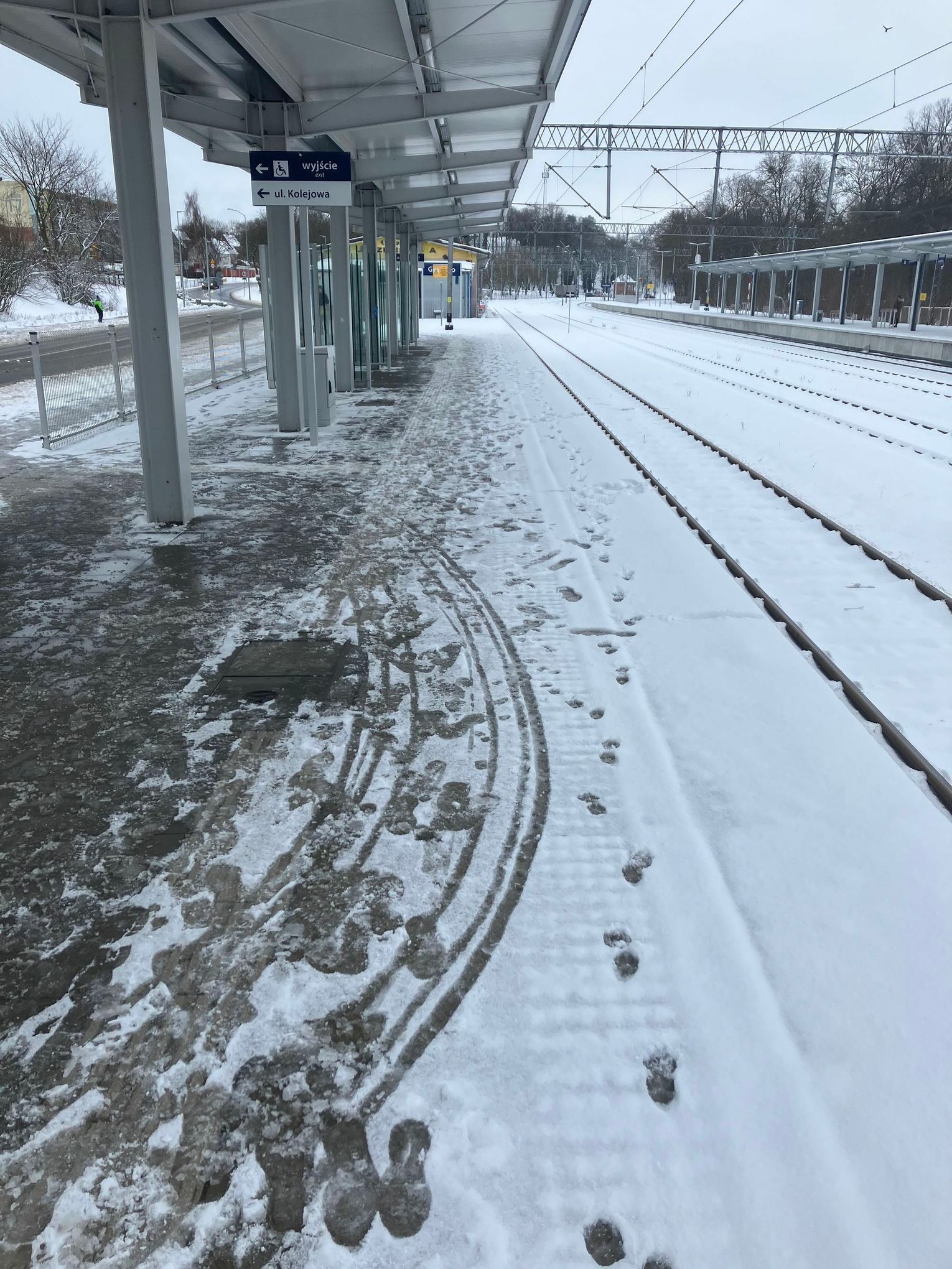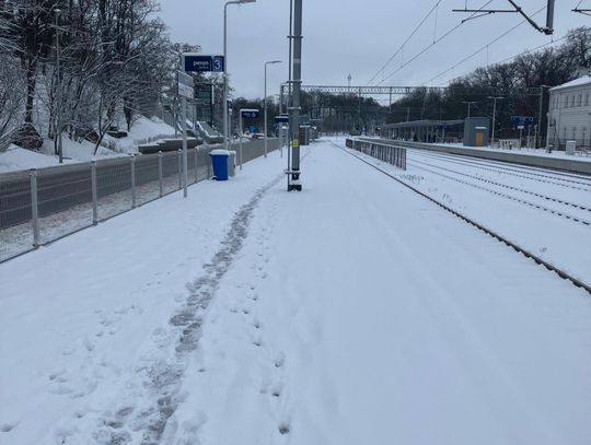 Drugi czytelnik zgłasza, że nikt nie zajmuje się odśnieżaniem peronów i schodów. Świadczą o tym zdjęcia wykonane w sobotę, 6 stycznia 2024 r., o godzinie 13:00, tuż przed wjazdem pociągu na peron.