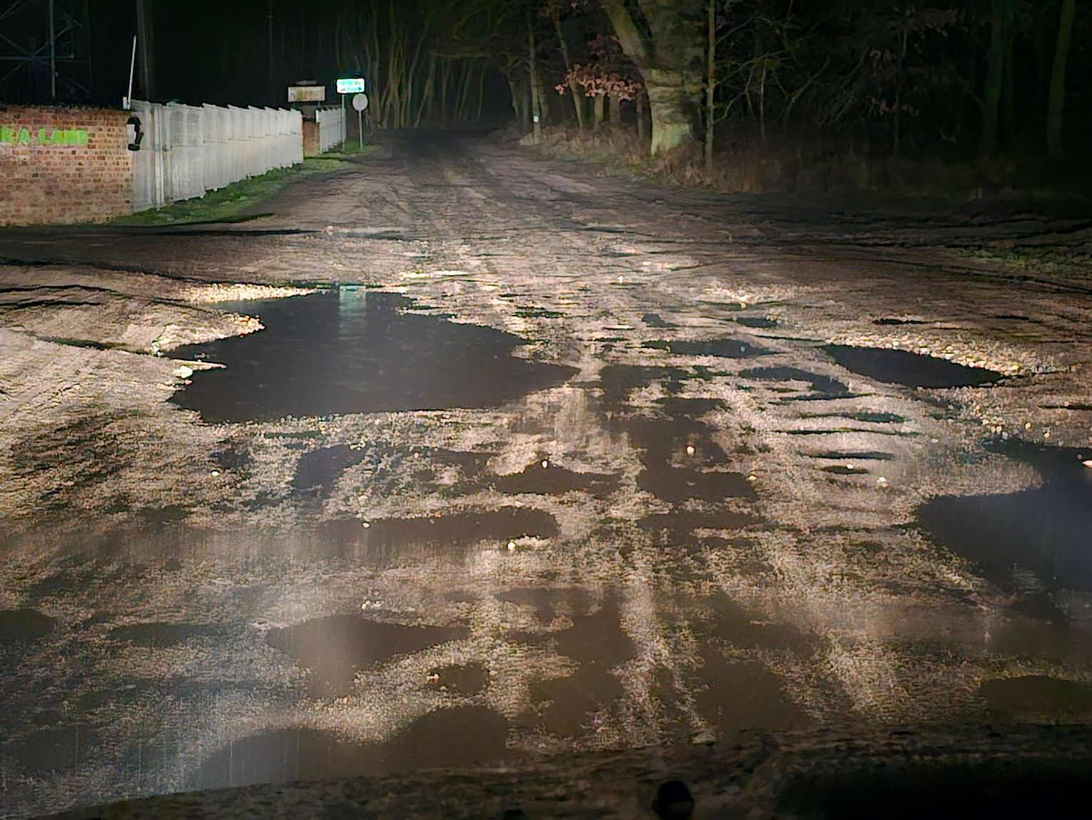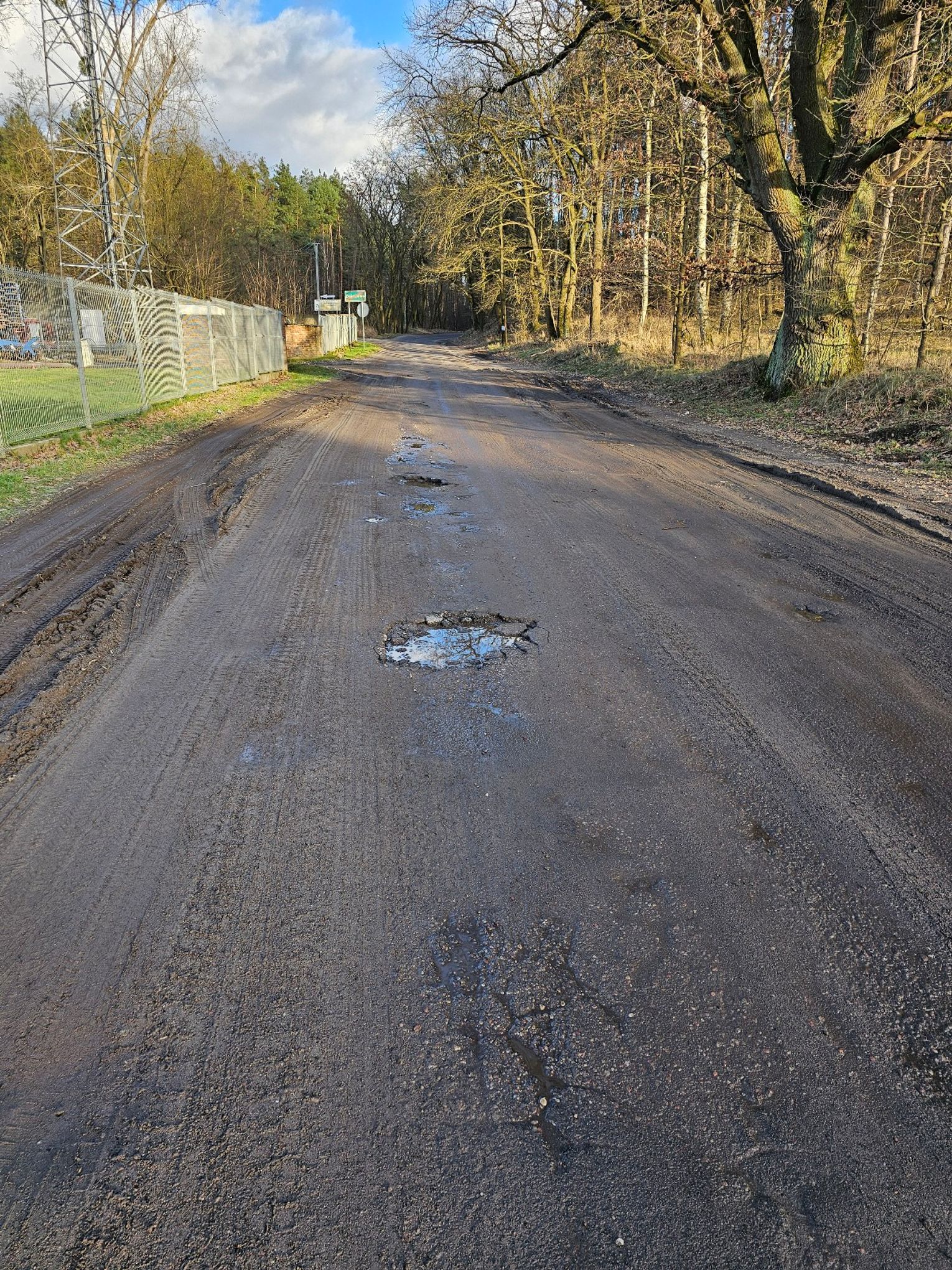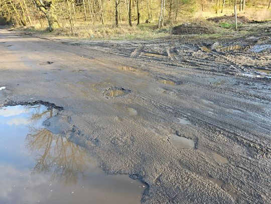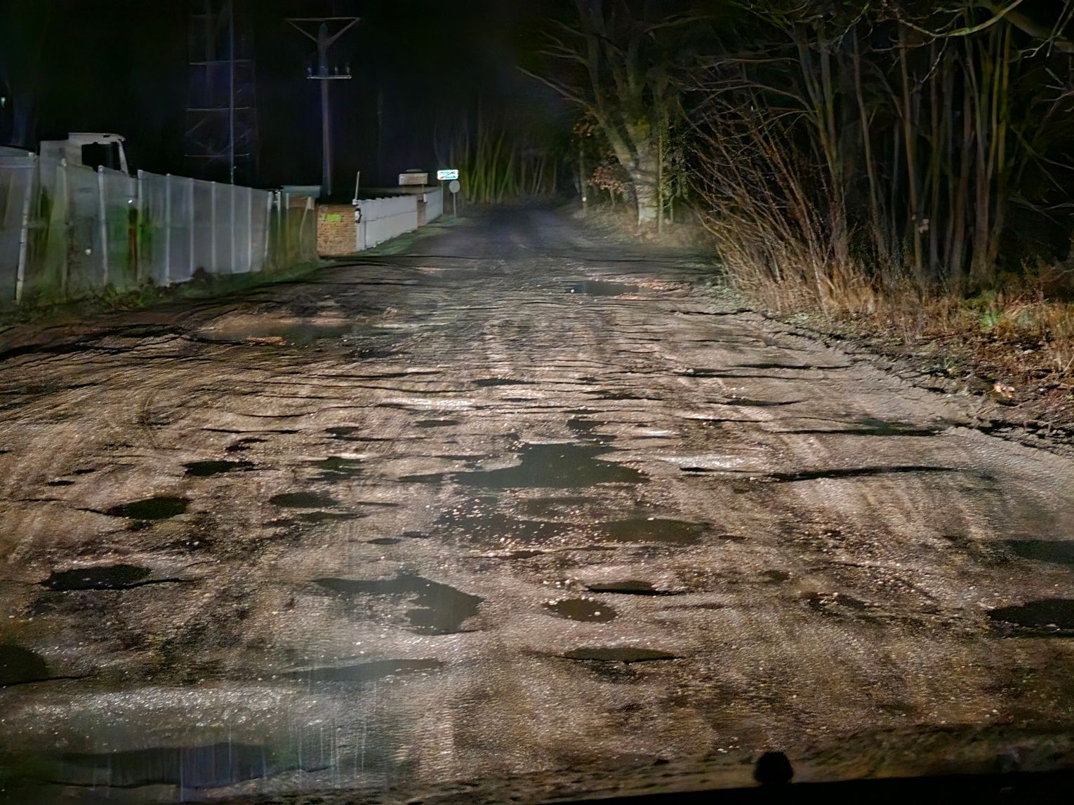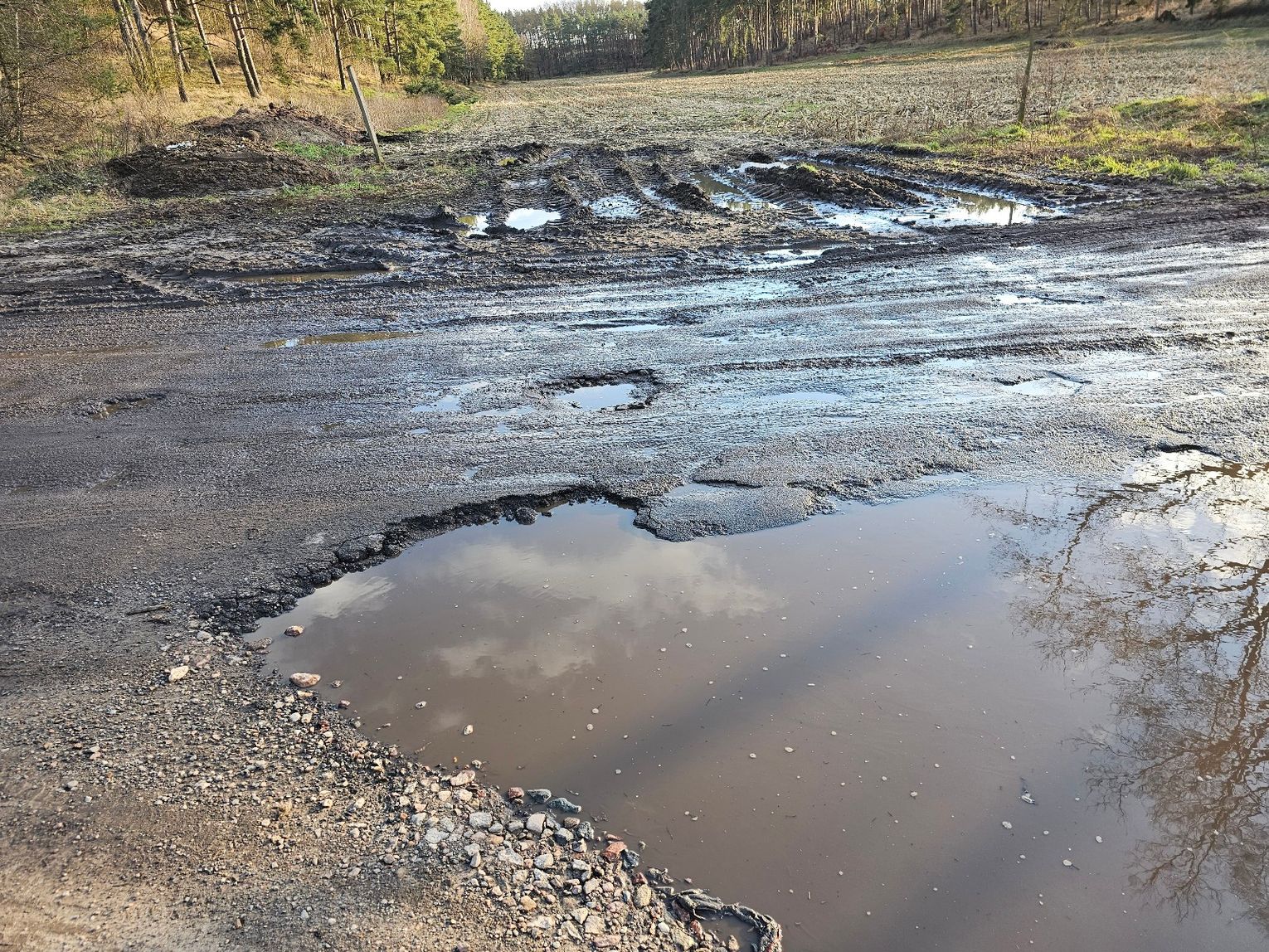 To trakt albo dukt leśny, a nie droga. By przejechać ten odcinek to tylko slalomem po poboczach które i ta są już rozjeżdżone zdjęcia. Stan zmienia się z doby na dobę jadąc w jedną stronę a powrót tą samą drogą, to już wybór innej opcji przejazdu. Zamieściłem również zdjęcia w nocy każda kałuża to dziura. To takie „Wilcze doły” bo nie wiesz czy pod tą