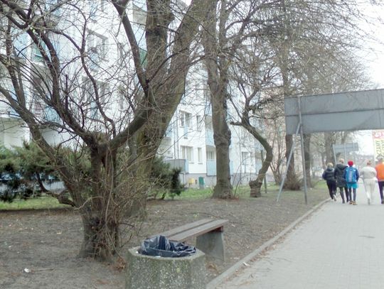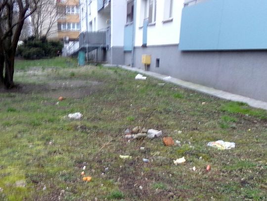 Zamiast korzystać ze znajdującego się po drugiej stronie bloku śmietnika, niektórzy niefrasobliwi mieszkańcy decydują się na wyrzucanie śmieci przez okno na trawnik. Efektem tego są rozrzucone papierki, kawałki chleba i inne odpadki, które psują wygląd otoczenia, zwłaszcza że trawnik znajduje się przy głównej ulicy.