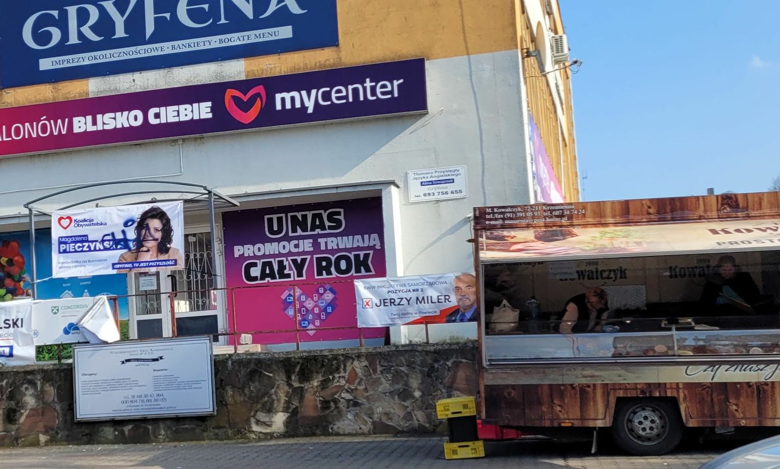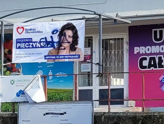 Na Gryfenie w centrum Gryfina plakat kandydatki na burmistrza Magdaleny Pieczyńskiej został popisany. Efekt widzimy na zdjęciach.