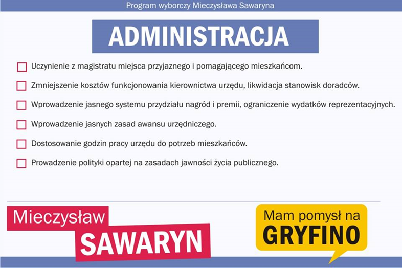 | Prowadzenie polityki opartej na zasadach jawności życia publicznego | Nie | Wypowiadam się z osobistego doświadczenia. Odmówiono mi udostępnienia informacji przygotowanej przez Burmistrza M. Sawaryna przy współpracy radcy prawnego opłacanego z pieniędzy podatników! |