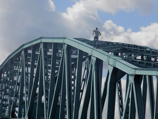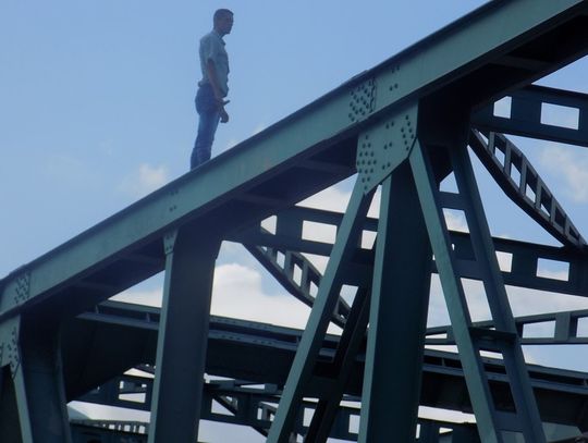 Nagle kucnął i zjechał po przęśle mostu jak po ślizgawce… prosto na rozłożony skokochron! A jak tylko stanął na ziemi, natychmiast rączo jak jeleń zamierzał umykać w dół po schodach. Jednak panowie z właściwych służb dopadli dowcipnisia i zapakowali do karetki.